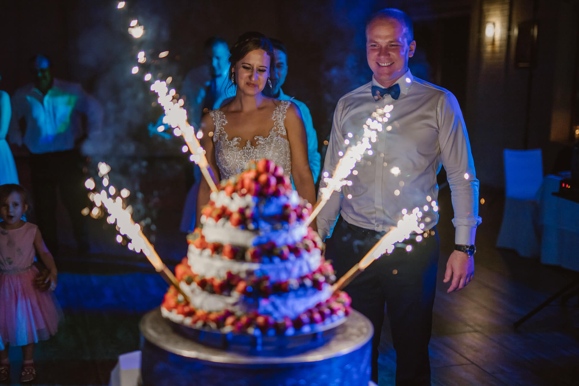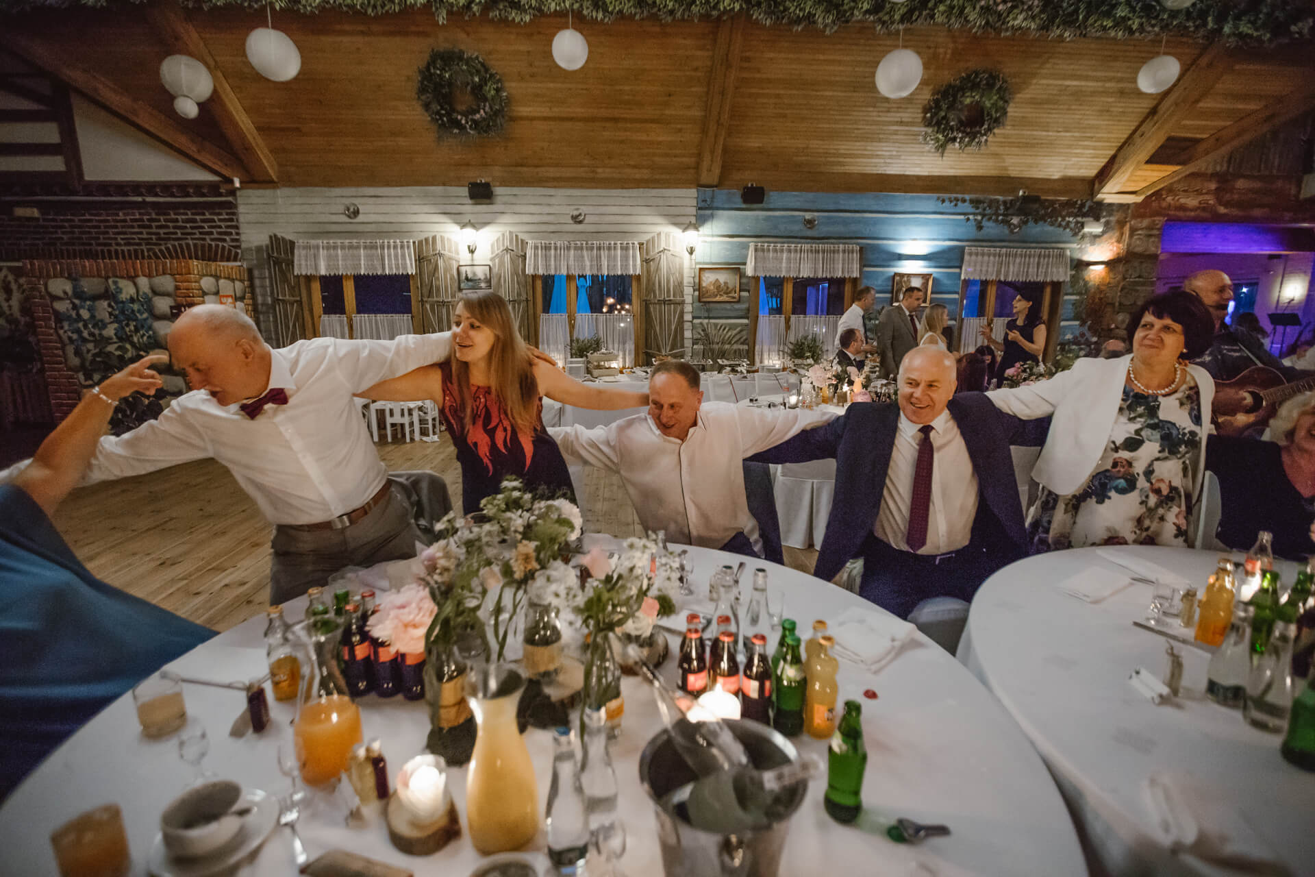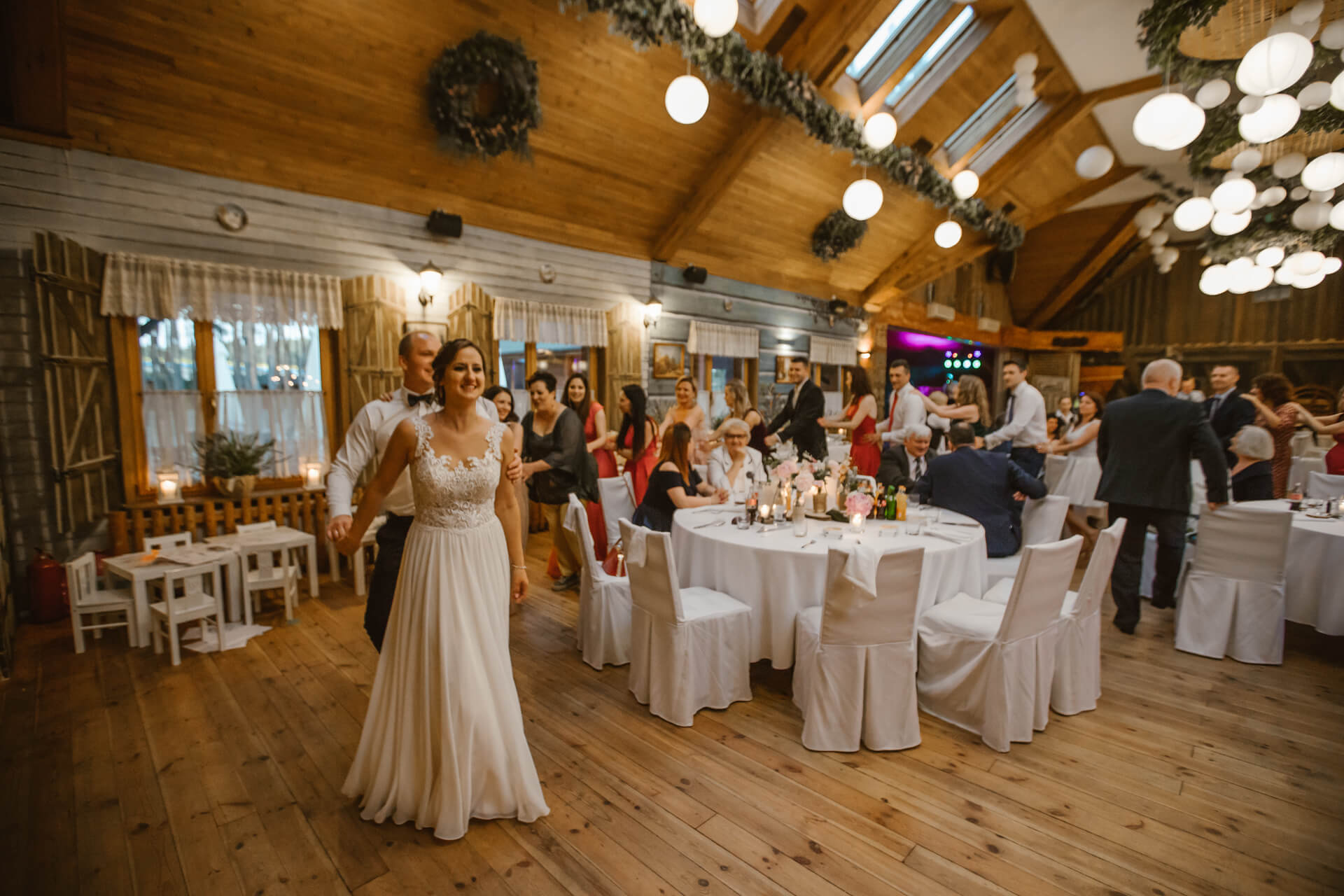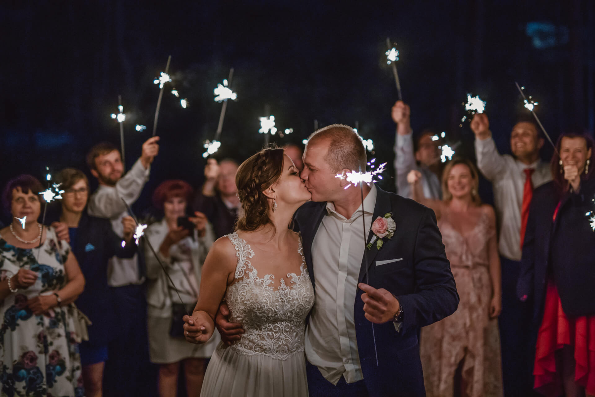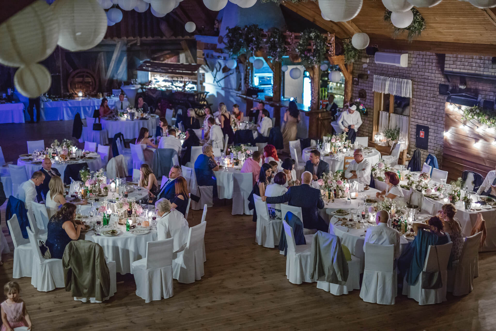 Sala weselna Stary Młyn ozdobiona w swojskim stylu wyglądała niesamowicie. Pięknie ozdobione stoły, stół wiejski, a raczej wóz wiejski robił mega wrażenia. Podwieszone do sufitu lampiony nadawały delikatnego oświetlenia sali, co bylo bardzo klimatyczne. W pewnym momencie wesela lamipony zostały zgaszony, na sali widać było tylko światło palących się świec. Efekt WOW! Wesele tradycyjnie zaczęło się od pierwszego tańca Państwa Młodych i z biegiem czasu nabierało tempa. Gości bawili się wyśmienicie, na parkiecie pojawił się Elvis Presley, który zrobił fantastyczne show. Apogeum zabawy nastąpiło, gdy zespół zszedł ze sceny i „poszedł w stoły”. Cała sala śpiewała razem z zespołem, goście na stojąco śpiewali piosenki razem z zespołem. Istnym szaleństwem było to, że goście zaczęli zsuwać wszystkie okrągłe stoły w jeden duży, machali serwetkami i tańczyli w objęciu osób stojących obok. Bomba enrgii na sali! Po tak aktywnej zabawie nadszedł czas na oczepiny po których udaliśmy się wykonać zdjęcia Pary Młodej w otoczeniu zimnych ognii. Ślub w plenerze, szalone wesele – to był cudowny dzień dla Kasi i Piotrka.