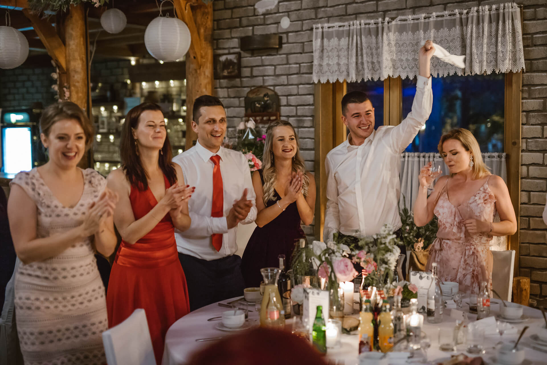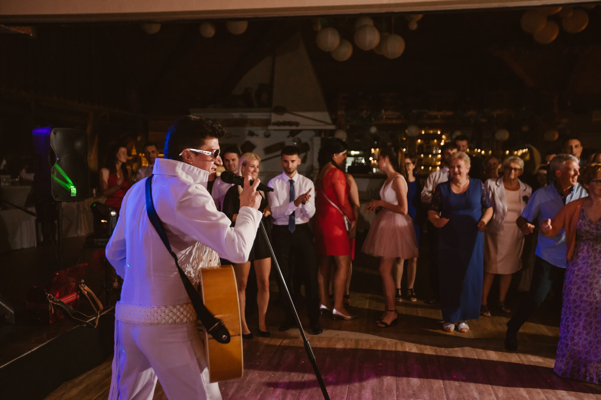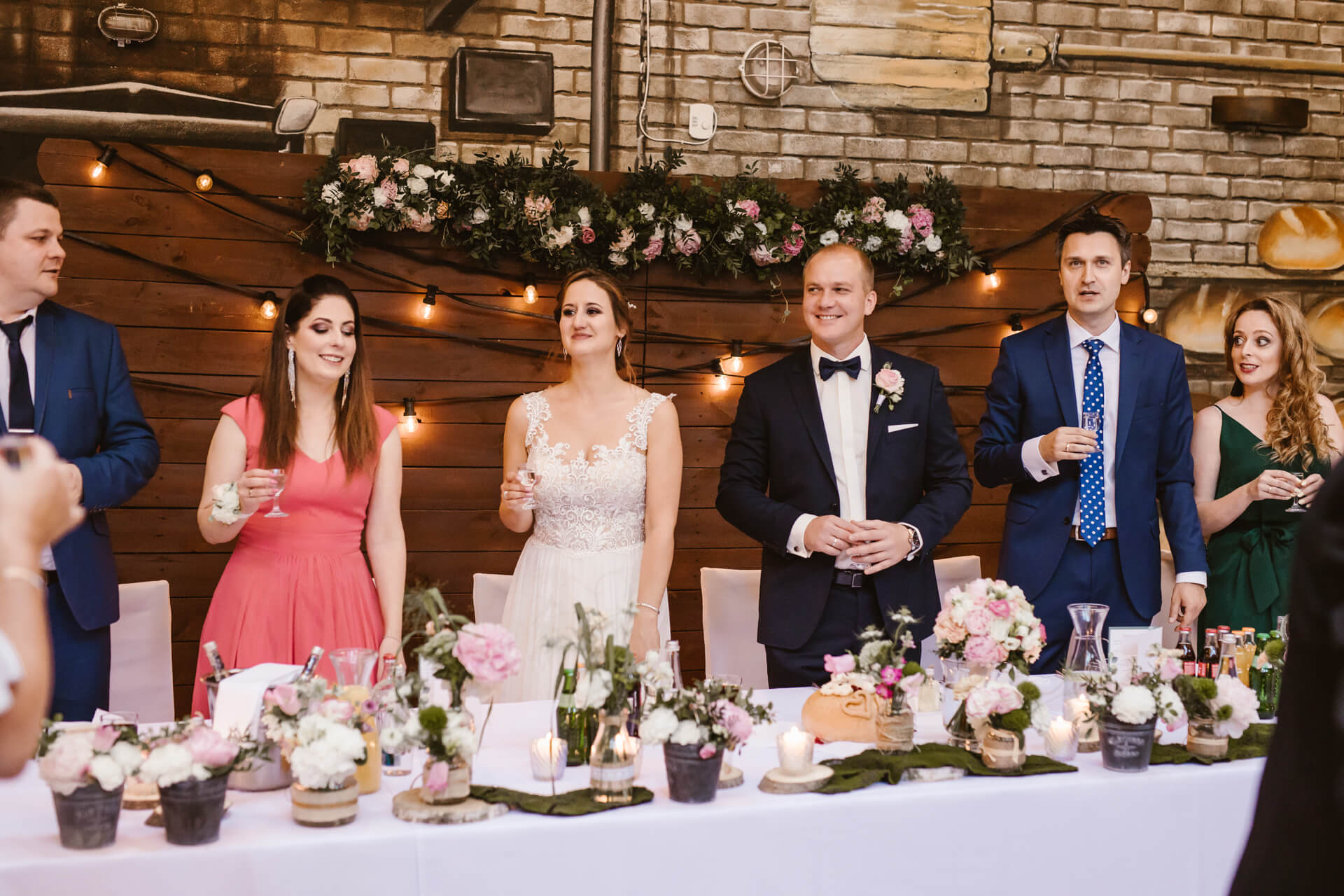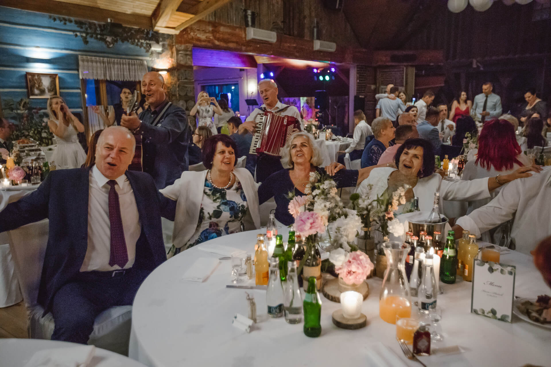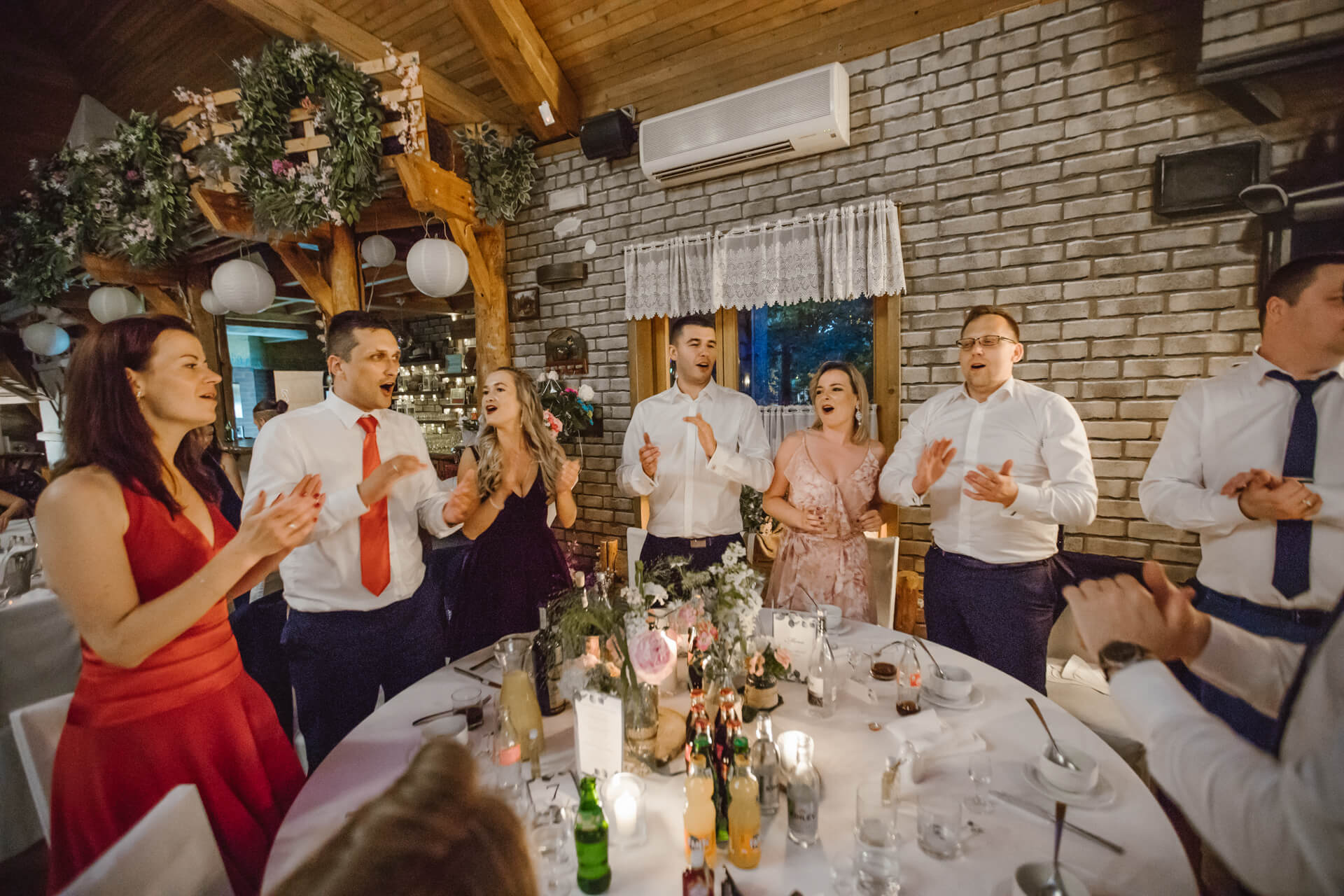 Sala weselna Stary Młyn ozdobiona w swojskim stylu wyglądała niesamowicie. Pięknie ozdobione stoły, stół wiejski, a raczej wóz wiejski robił mega wrażenia. Podwieszone do sufitu lampiony nadawały delikatnego oświetlenia sali, co bylo bardzo klimatyczne. W pewnym momencie wesela lamipony zostały zgaszony, na sali widać było tylko światło palących się świec. Efekt WOW! Wesele tradycyjnie zaczęło się od pierwszego tańca Państwa Młodych i z biegiem czasu nabierało tempa. Gości bawili się wyśmienicie, na parkiecie pojawił się Elvis Presley, który zrobił fantastyczne show. Apogeum zabawy nastąpiło, gdy zespół zszedł ze sceny i „poszedł w stoły”. Cała sala śpiewała razem z zespołem, goście na stojąco śpiewali piosenki razem z zespołem. Istnym szaleństwem było to, że goście zaczęli zsuwać wszystkie okrągłe stoły w jeden duży, machali serwetkami i tańczyli w objęciu osób stojących obok. Bomba enrgii na sali! Po tak aktywnej zabawie nadszedł czas na oczepiny po których udaliśmy się wykonać zdjęcia Pary Młodej w otoczeniu zimnych ognii. Ślub w plenerze, szalone wesele – to był cudowny dzień dla Kasi i Piotrka.
