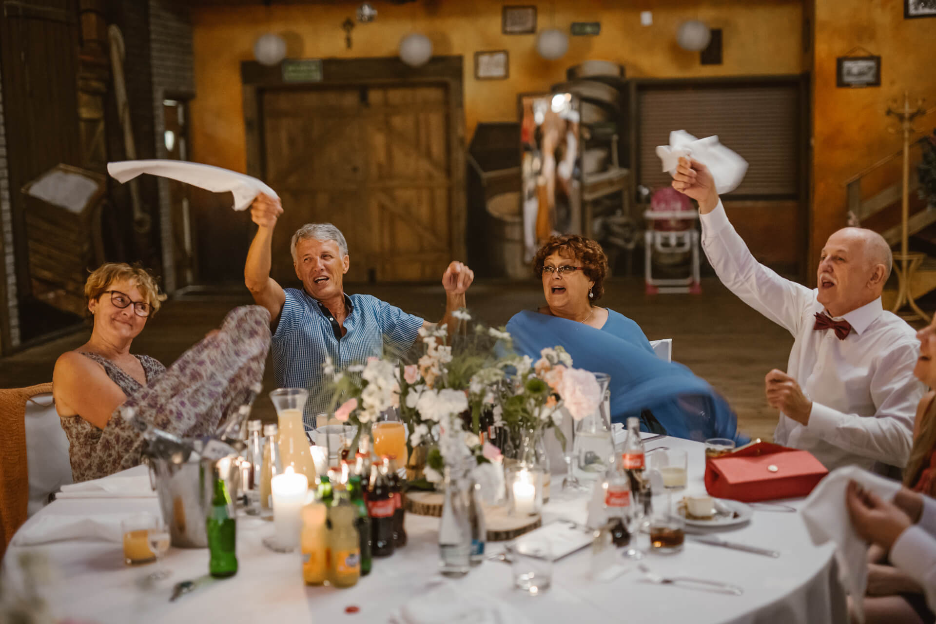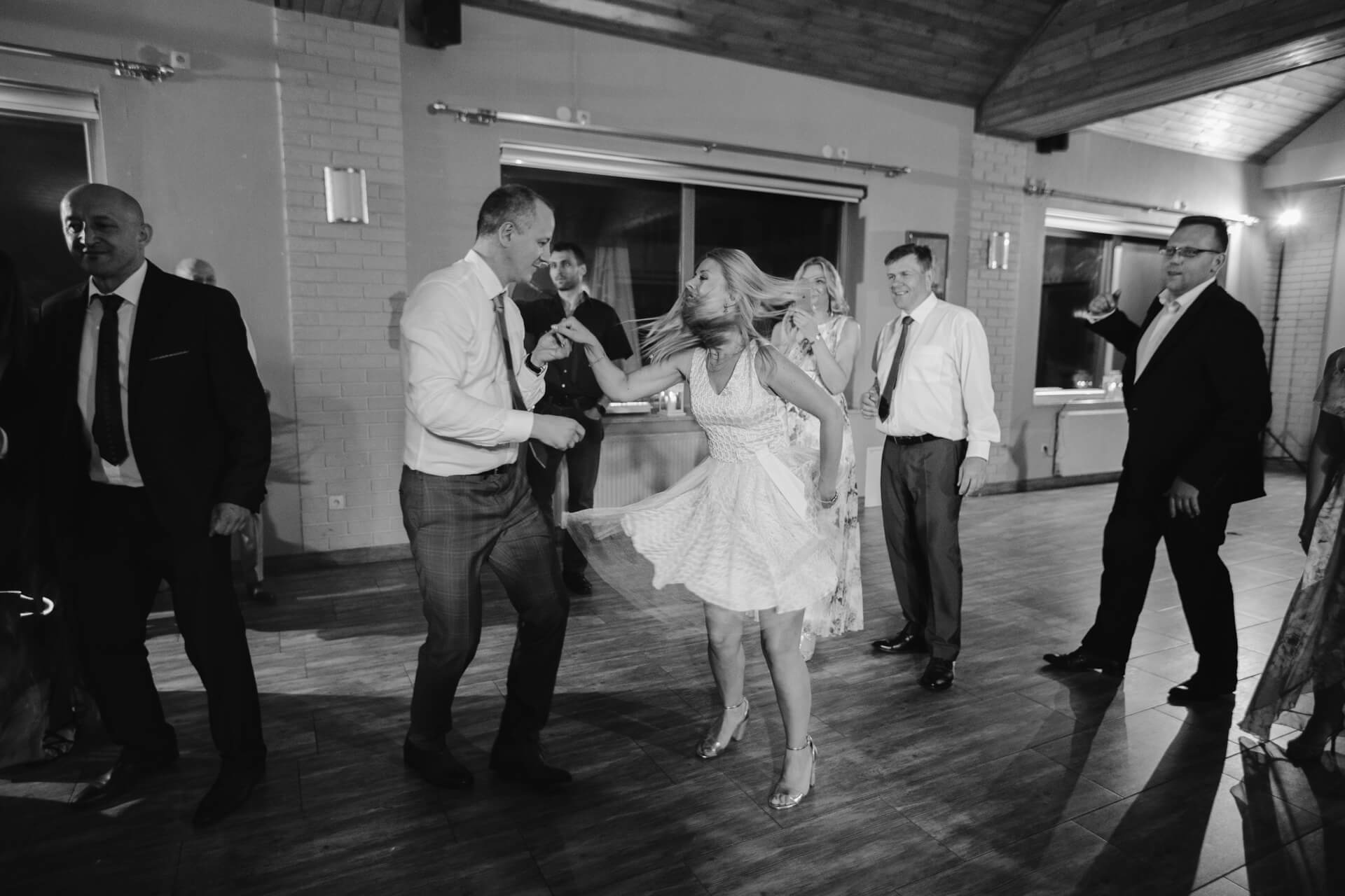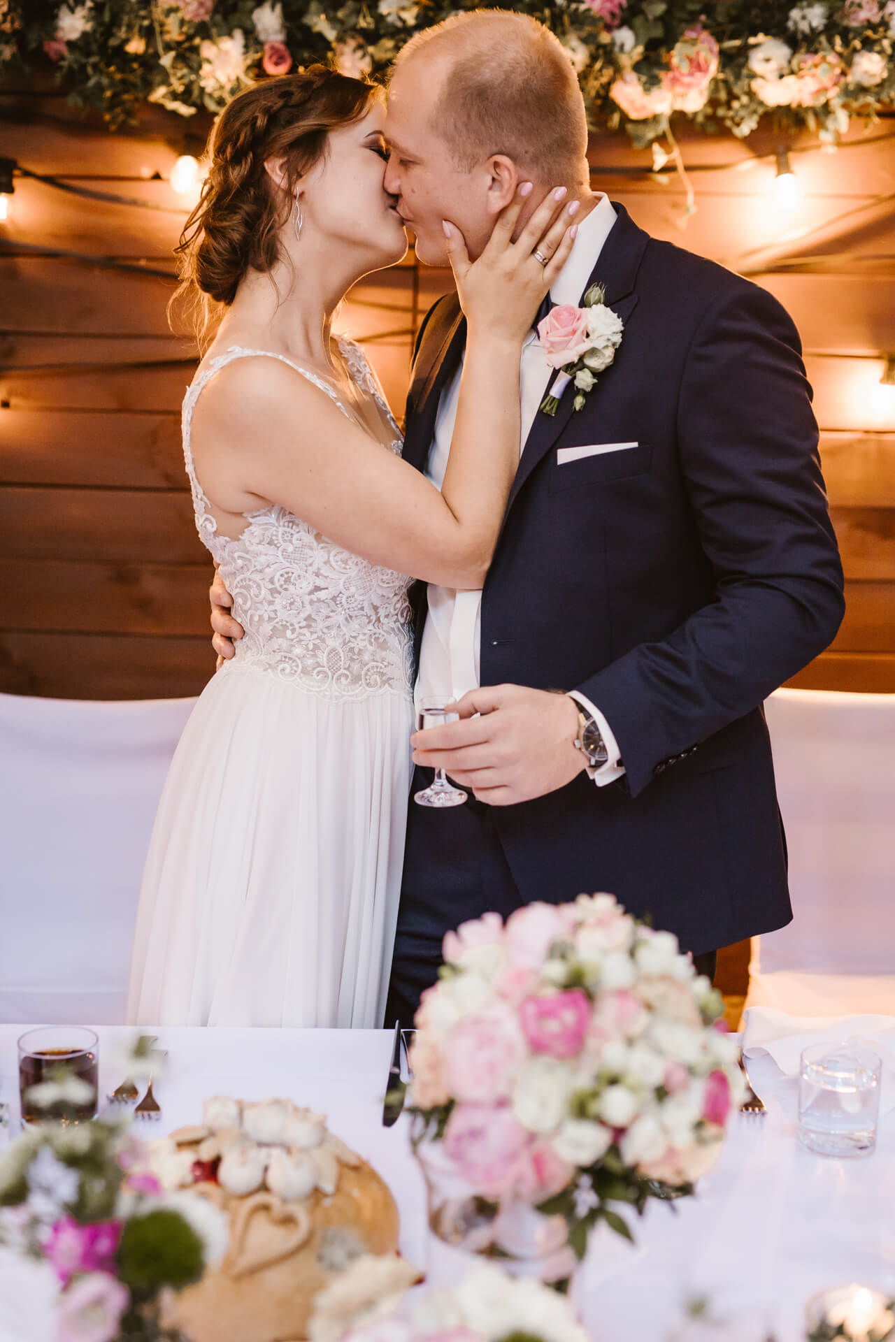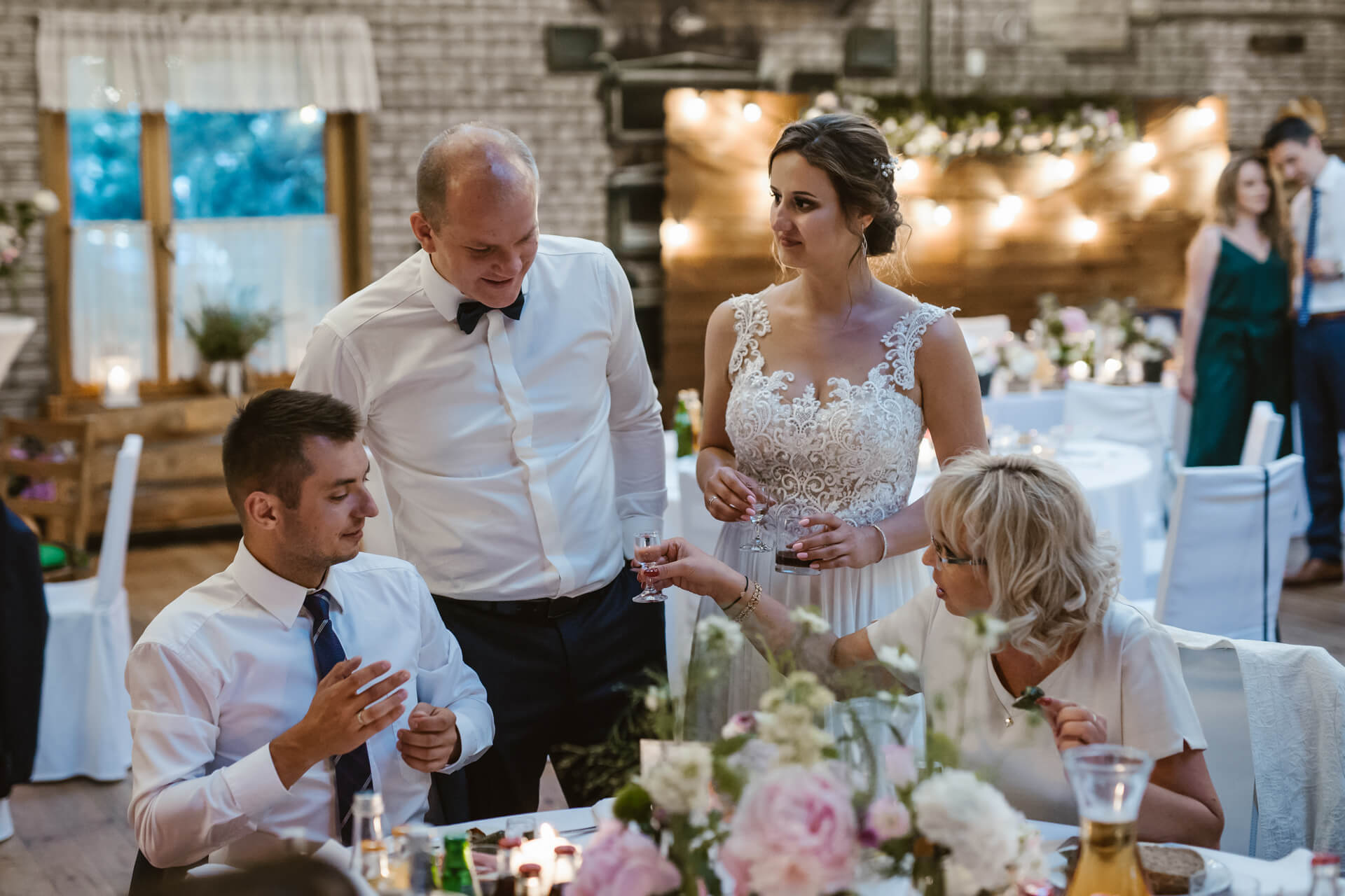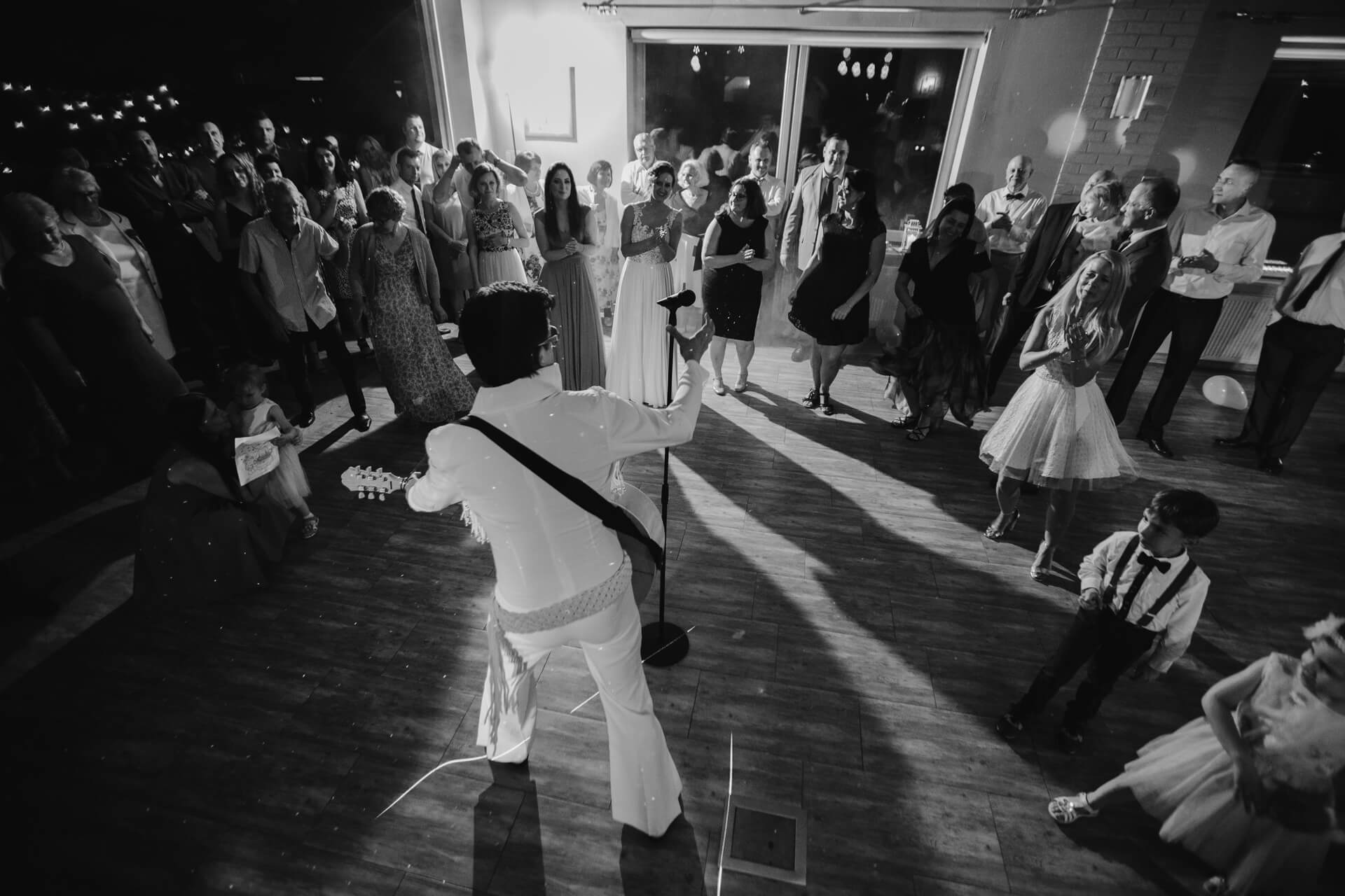 Sala weselna Stary Młyn ozdobiona w swojskim stylu wyglądała niesamowicie. Pięknie ozdobione stoły, stół wiejski, a raczej wóz wiejski robił mega wrażenia. Podwieszone do sufitu lampiony nadawały delikatnego oświetlenia sali, co bylo bardzo klimatyczne. W pewnym momencie wesela lamipony zostały zgaszony, na sali widać było tylko światło palących się świec. Efekt WOW! Wesele tradycyjnie zaczęło się od pierwszego tańca Państwa Młodych i z biegiem czasu nabierało tempa. Gości bawili się wyśmienicie, na parkiecie pojawił się Elvis Presley, który zrobił fantastyczne show. Apogeum zabawy nastąpiło, gdy zespół zszedł ze sceny i „poszedł w stoły”. Cała sala śpiewała razem z zespołem, goście na stojąco śpiewali piosenki razem z zespołem. Istnym szaleństwem było to, że goście zaczęli zsuwać wszystkie okrągłe stoły w jeden duży, machali serwetkami i tańczyli w objęciu osób stojących obok. Bomba enrgii na sali! Po tak aktywnej zabawie nadszedł czas na oczepiny po których udaliśmy się wykonać zdjęcia Pary Młodej w otoczeniu zimnych ognii. Ślub w plenerze, szalone wesele – to był cudowny dzień dla Kasi i Piotrka.