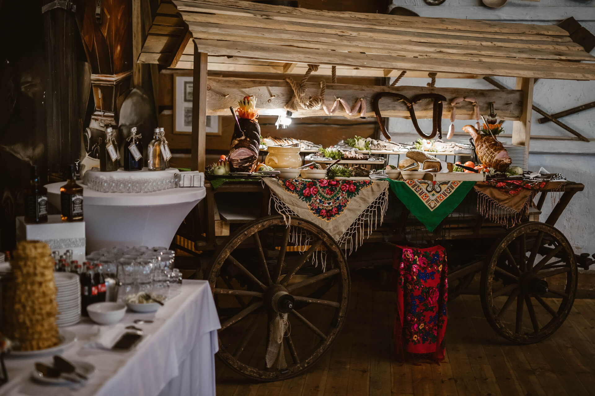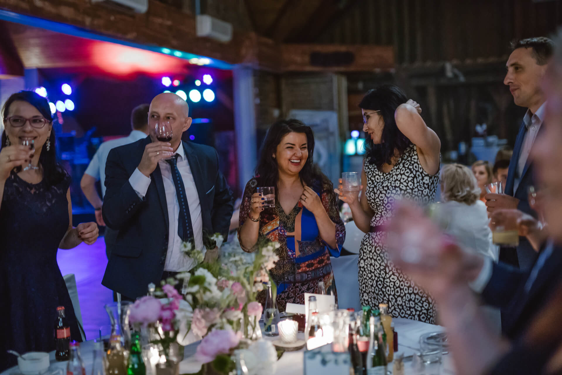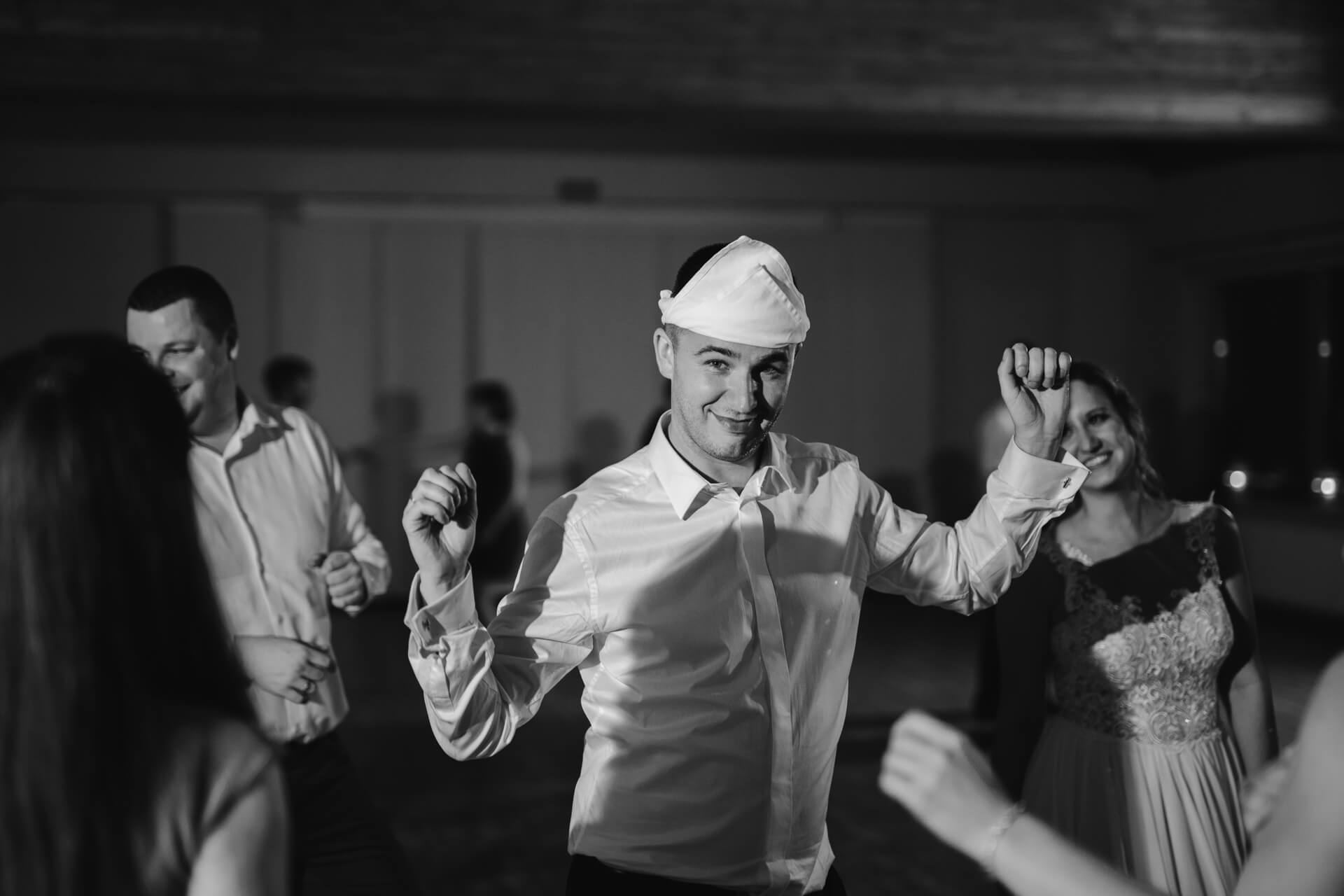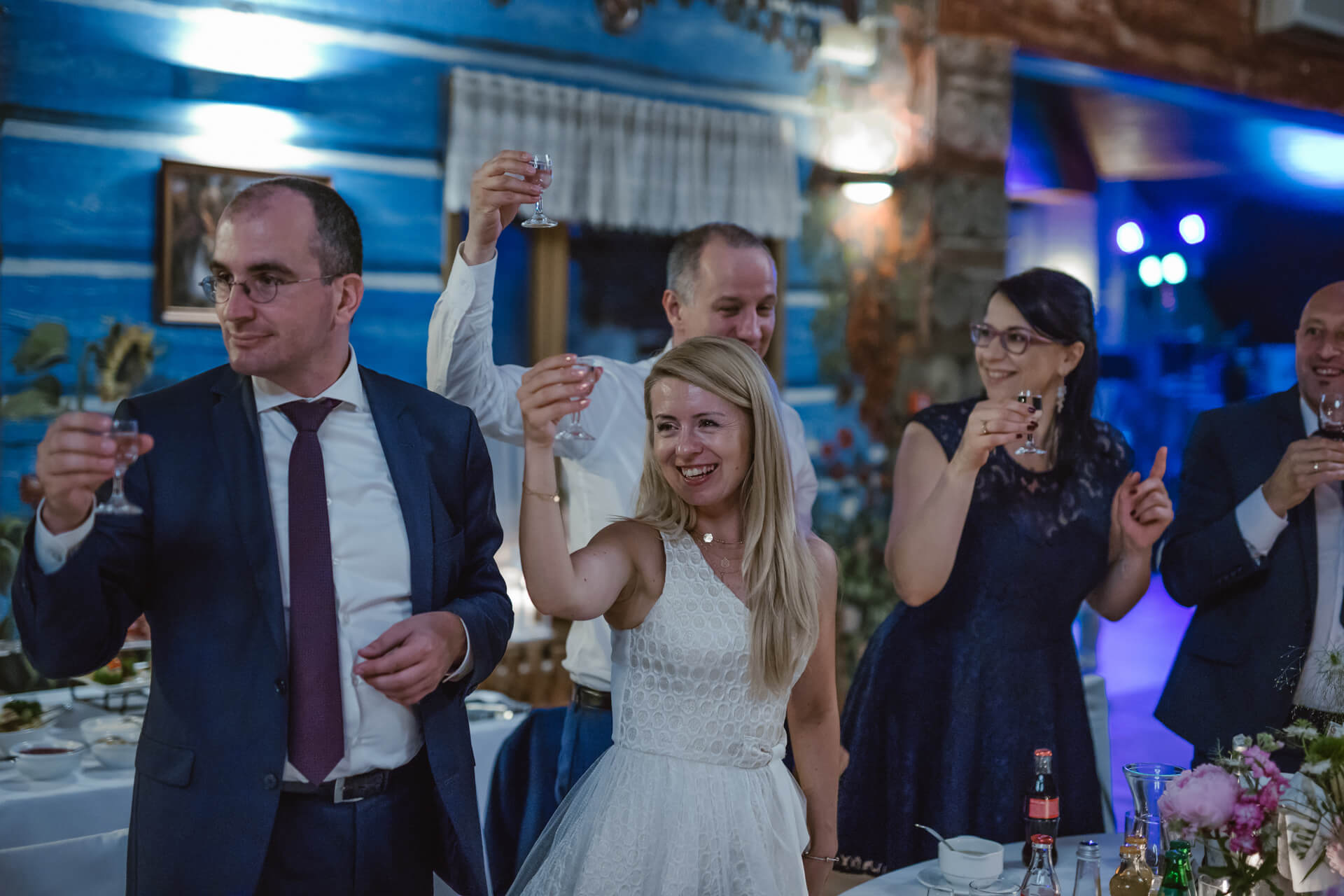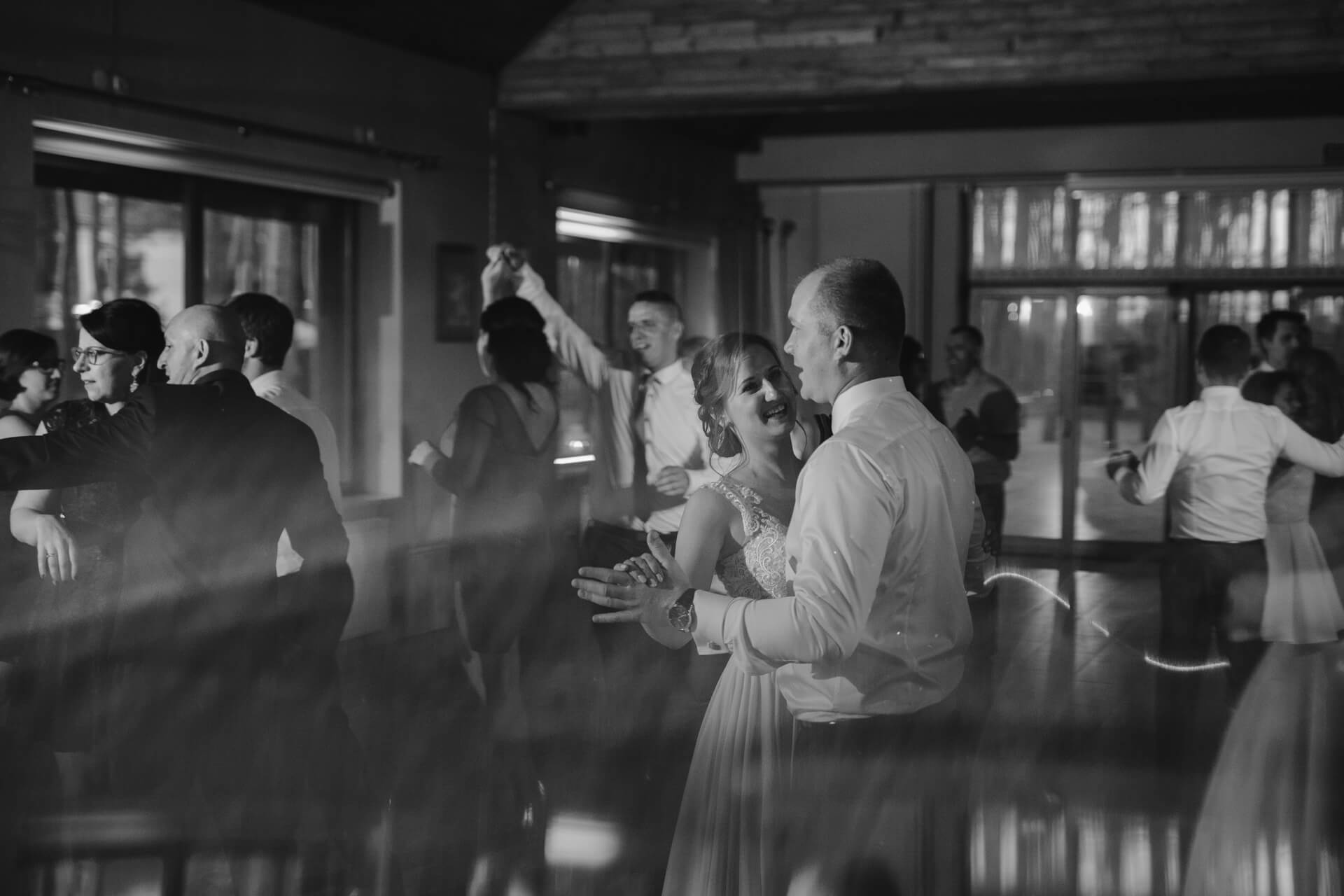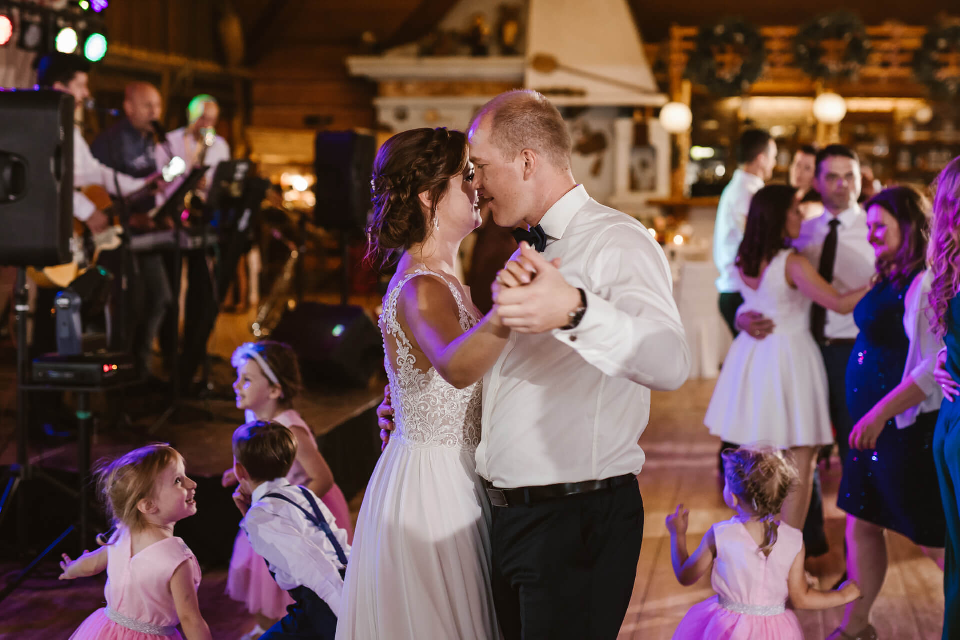 Sala weselna Stary Młyn ozdobiona w swojskim stylu wyglądała niesamowicie. Pięknie ozdobione stoły, stół wiejski, a raczej wóz wiejski robił mega wrażenia. Podwieszone do sufitu lampiony nadawały delikatnego oświetlenia sali, co bylo bardzo klimatyczne. W pewnym momencie wesela lamipony zostały zgaszony, na sali widać było tylko światło palących się świec. Efekt WOW! Wesele tradycyjnie zaczęło się od pierwszego tańca Państwa Młodych i z biegiem czasu nabierało tempa. Gości bawili się wyśmienicie, na parkiecie pojawił się Elvis Presley, który zrobił fantastyczne show. Apogeum zabawy nastąpiło, gdy zespół zszedł ze sceny i „poszedł w stoły”. Cała sala śpiewała razem z zespołem, goście na stojąco śpiewali piosenki razem z zespołem. Istnym szaleństwem było to, że goście zaczęli zsuwać wszystkie okrągłe stoły w jeden duży, machali serwetkami i tańczyli w objęciu osób stojących obok. Bomba enrgii na sali! Po tak aktywnej zabawie nadszedł czas na oczepiny po których udaliśmy się wykonać zdjęcia Pary Młodej w otoczeniu zimnych ognii. Ślub w plenerze, szalone wesele – to był cudowny dzień dla Kasi i Piotrka.