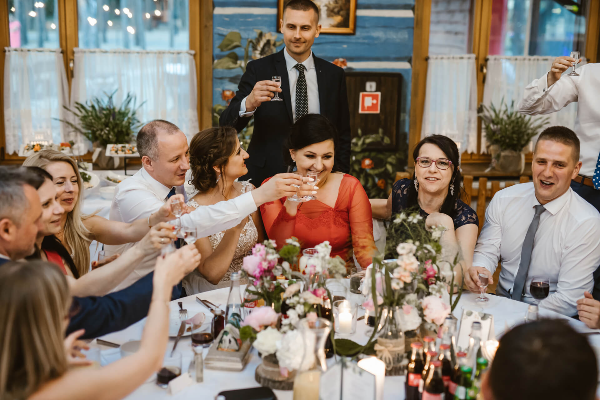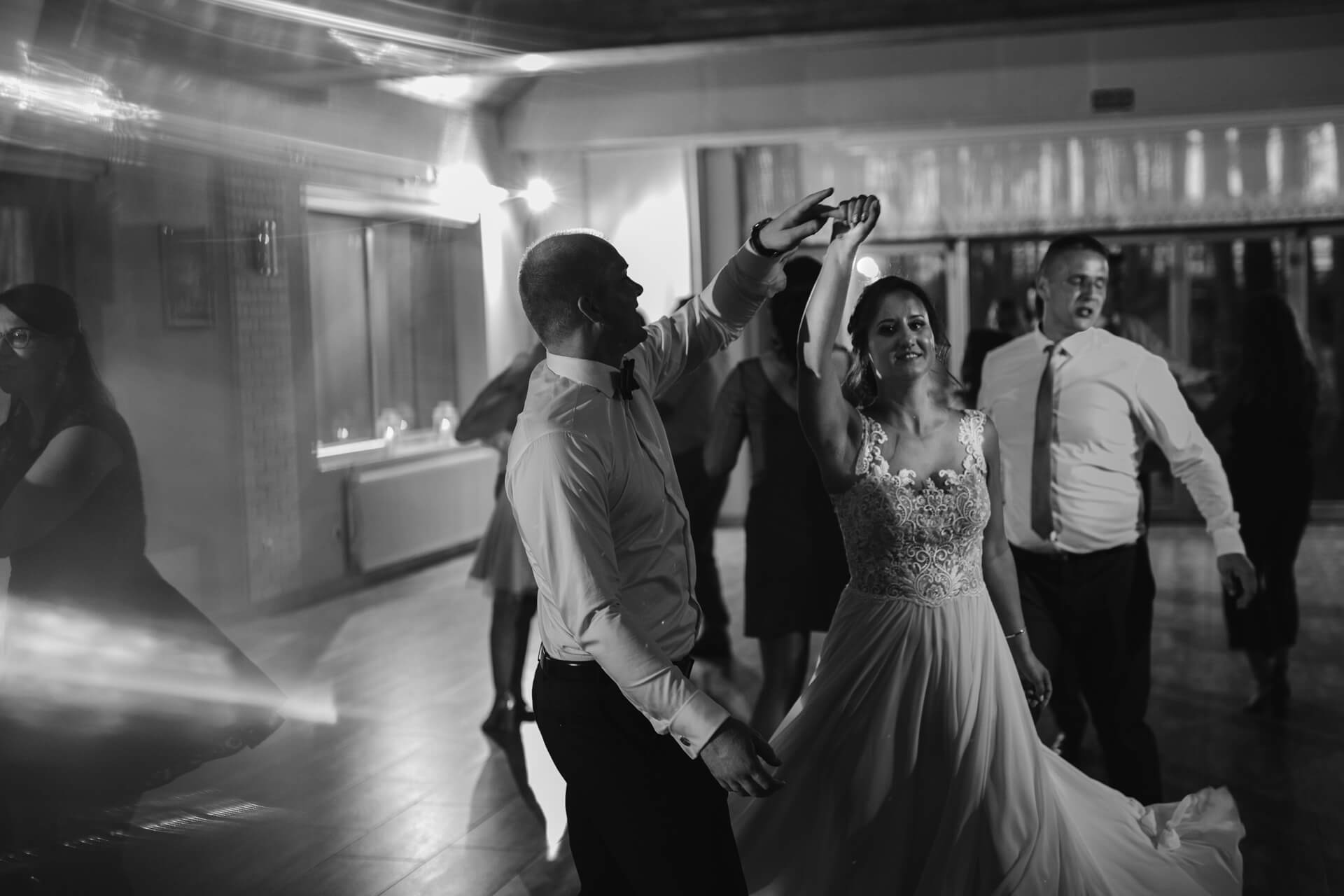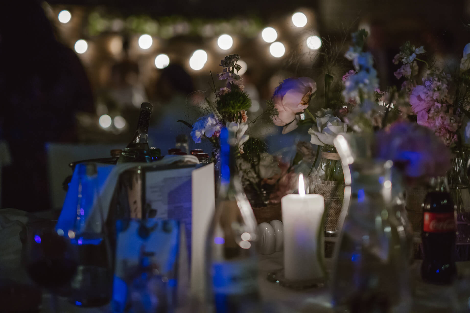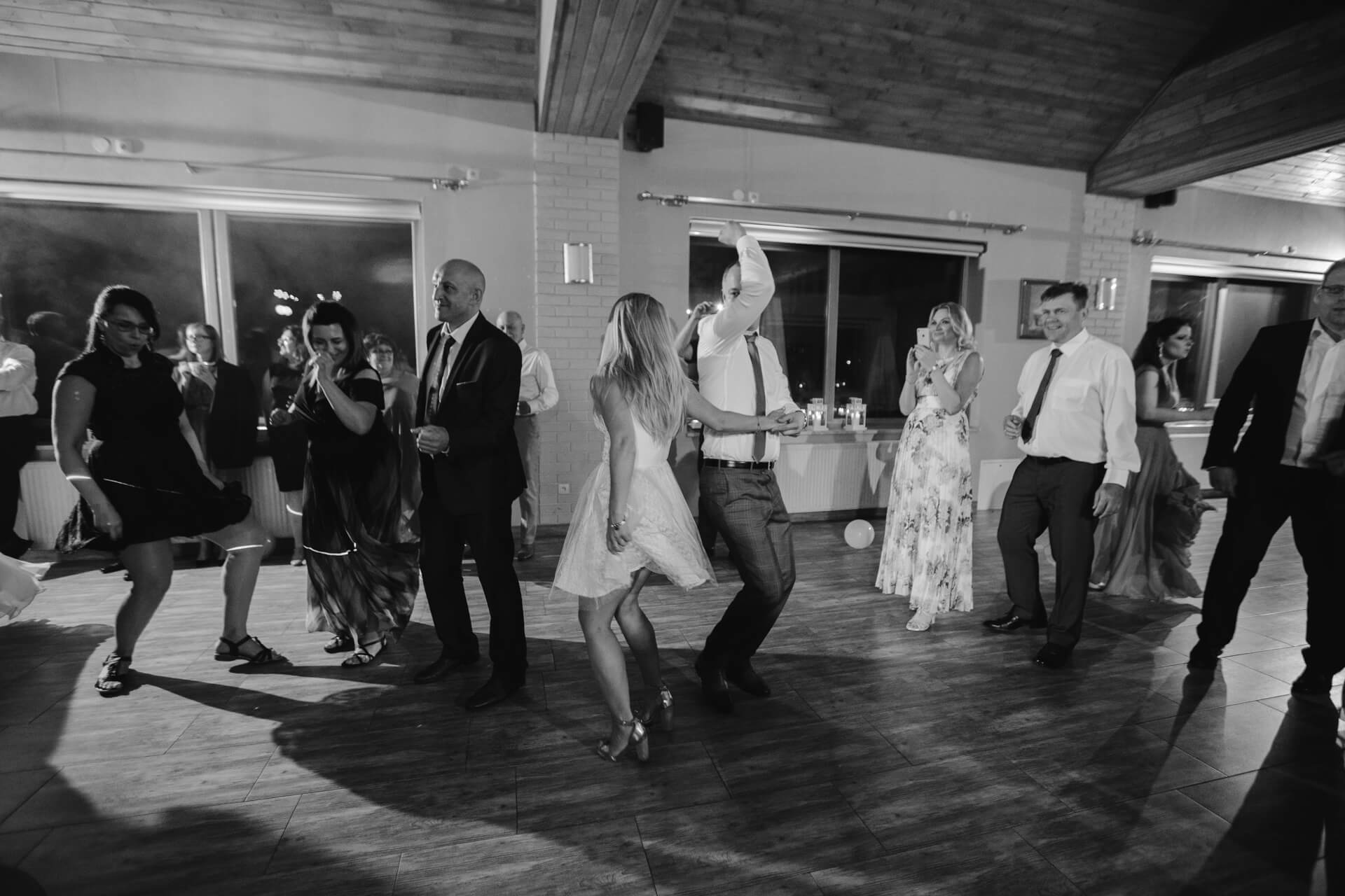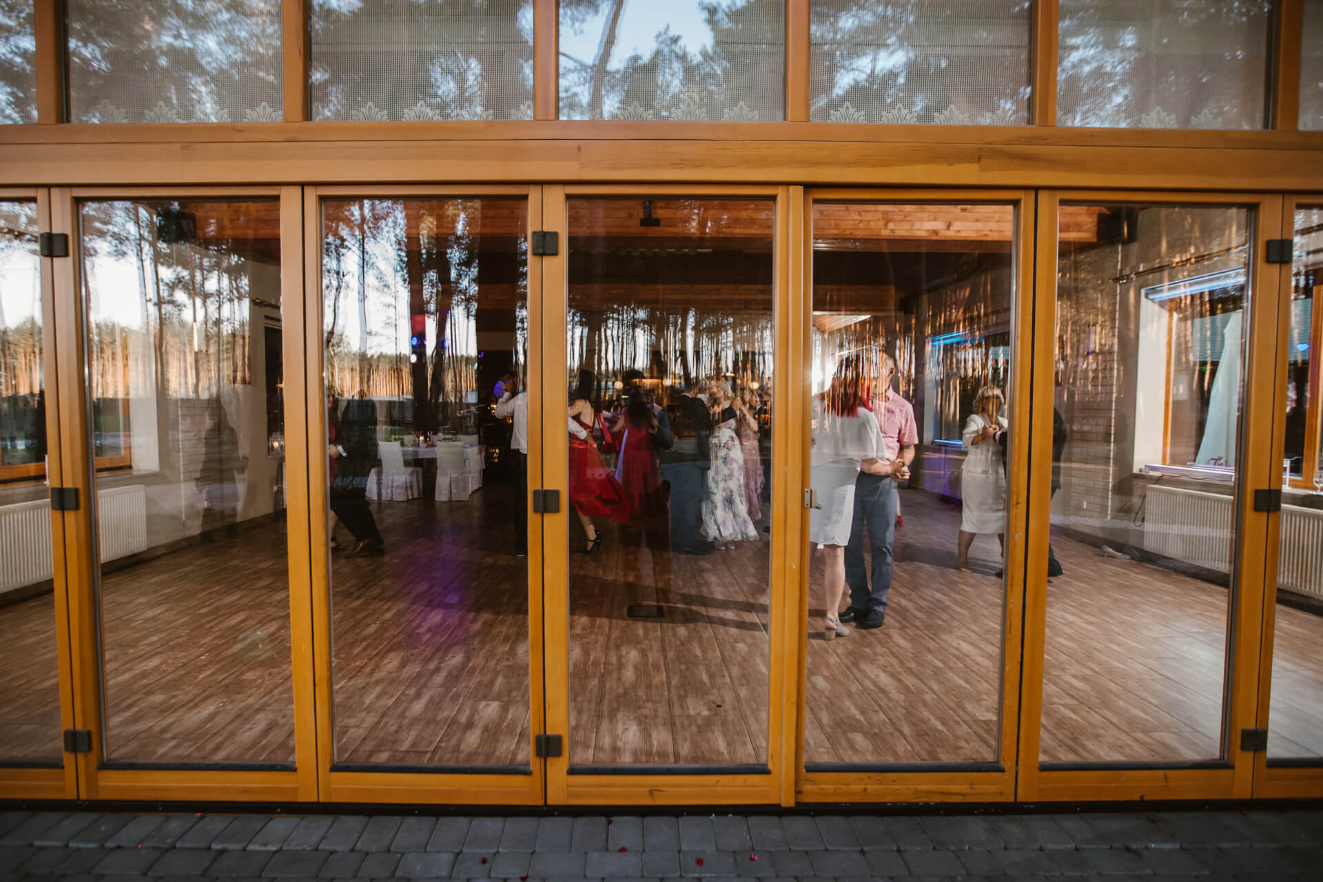 Sala weselna Stary Młyn ozdobiona w swojskim stylu wyglądała niesamowicie. Pięknie ozdobione stoły, stół wiejski, a raczej wóz wiejski robił mega wrażenia. Podwieszone do sufitu lampiony nadawały delikatnego oświetlenia sali, co bylo bardzo klimatyczne. W pewnym momencie wesela lamipony zostały zgaszony, na sali widać było tylko światło palących się świec. Efekt WOW! Wesele tradycyjnie zaczęło się od pierwszego tańca Państwa Młodych i z biegiem czasu nabierało tempa. Gości bawili się wyśmienicie, na parkiecie pojawił się Elvis Presley, który zrobił fantastyczne show. Apogeum zabawy nastąpiło, gdy zespół zszedł ze sceny i „poszedł w stoły”. Cała sala śpiewała razem z zespołem, goście na stojąco śpiewali piosenki razem z zespołem. Istnym szaleństwem było to, że goście zaczęli zsuwać wszystkie okrągłe stoły w jeden duży, machali serwetkami i tańczyli w objęciu osób stojących obok. Bomba enrgii na sali! Po tak aktywnej zabawie nadszedł czas na oczepiny po których udaliśmy się wykonać zdjęcia Pary Młodej w otoczeniu zimnych ognii. Ślub w plenerze, szalone wesele – to był cudowny dzień dla Kasi i Piotrka.