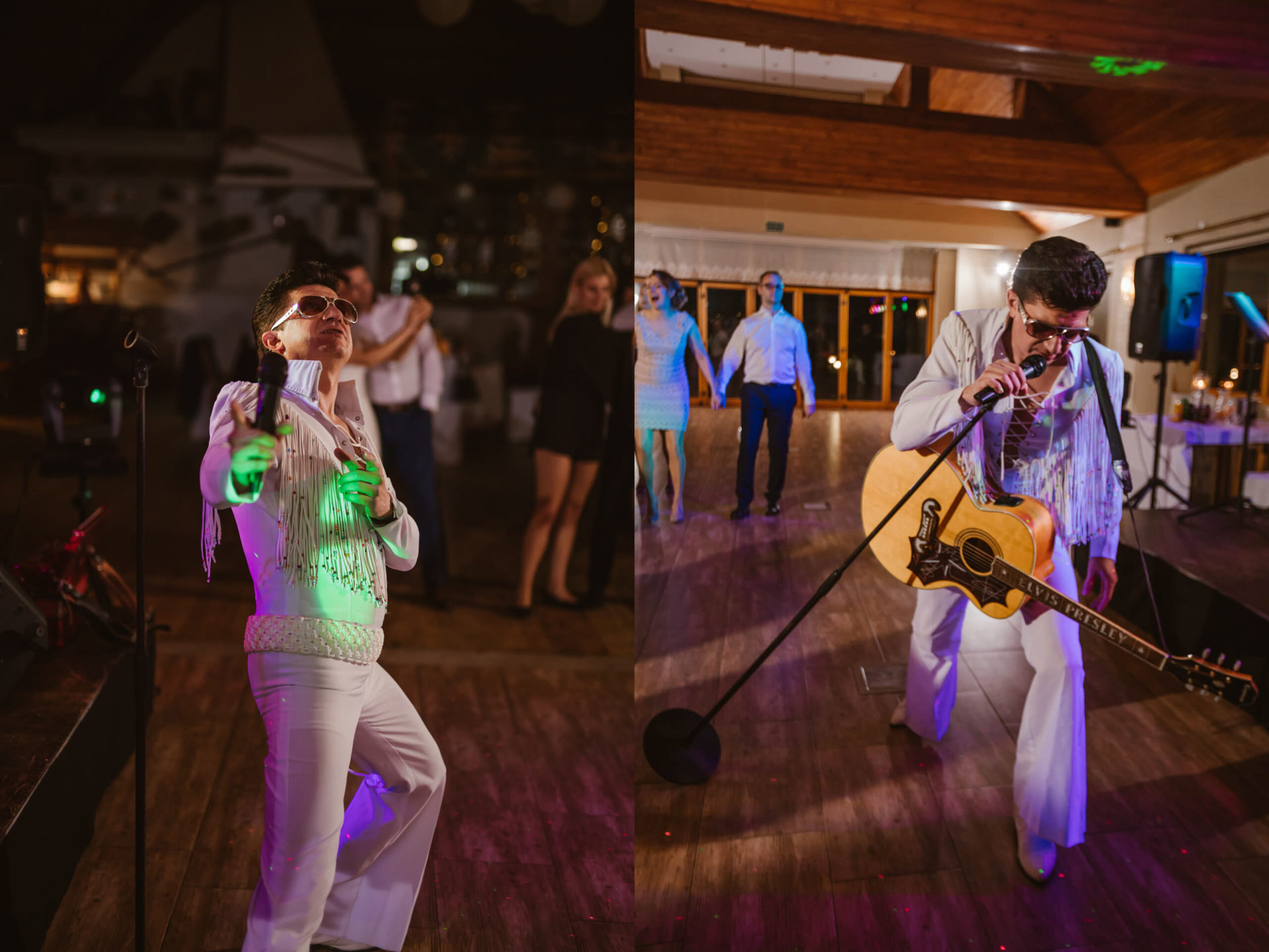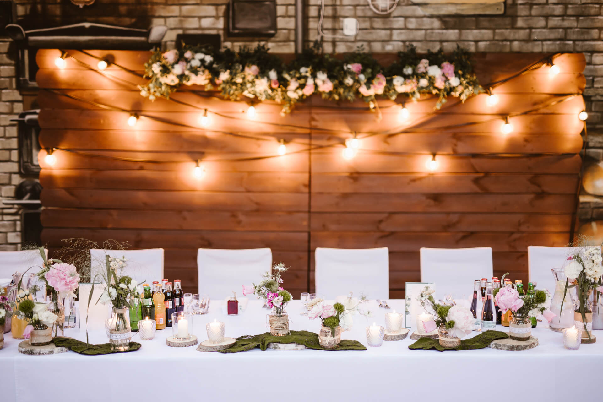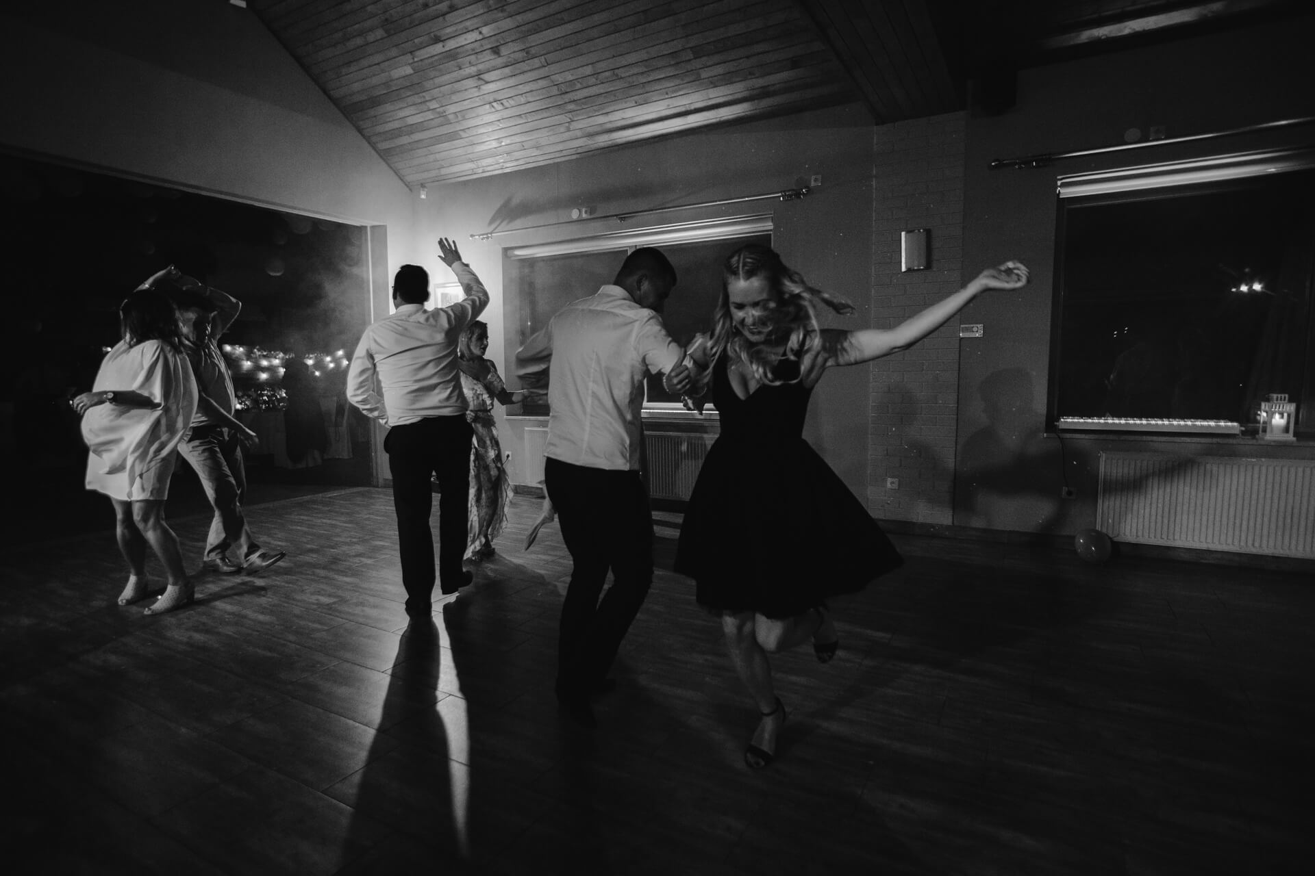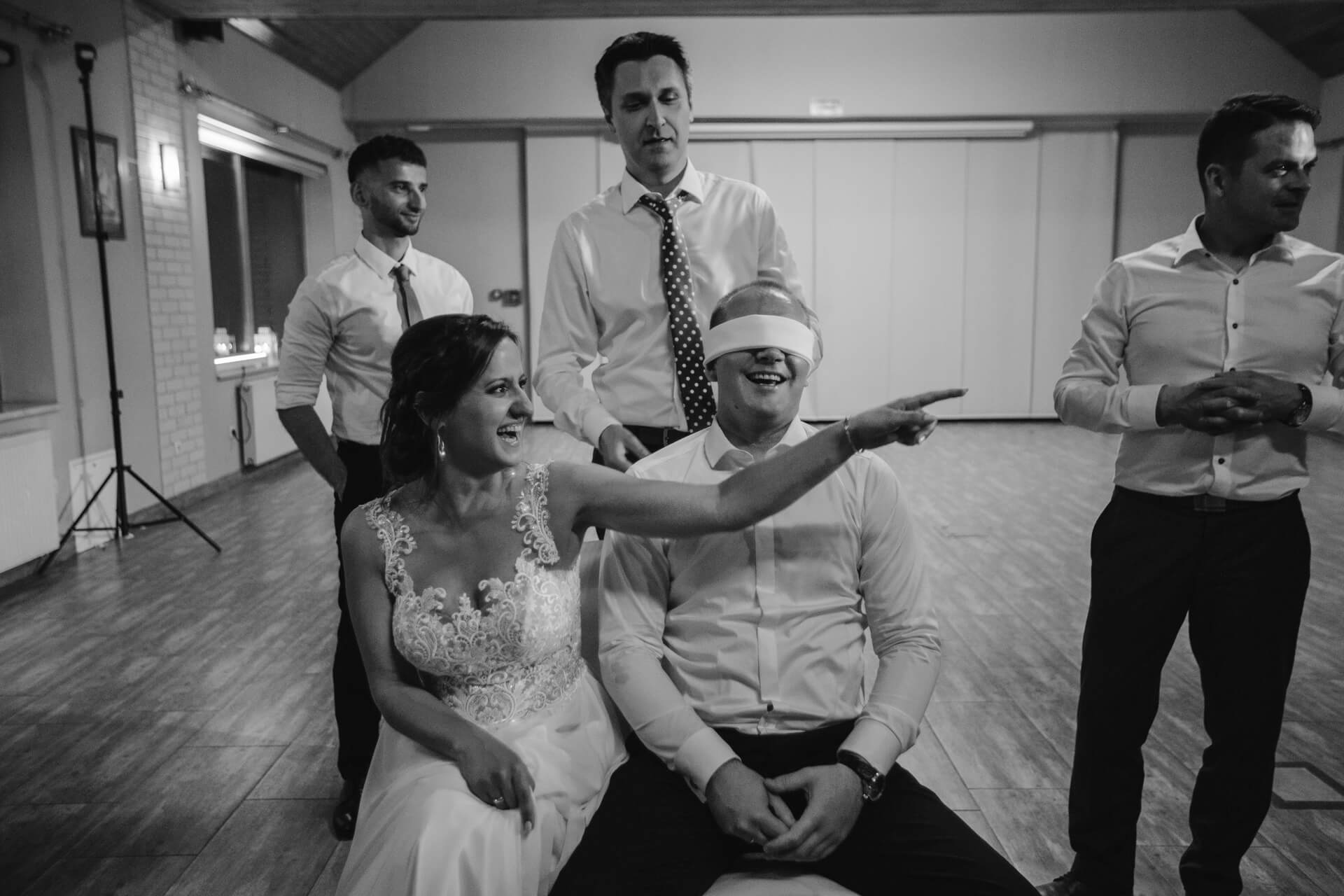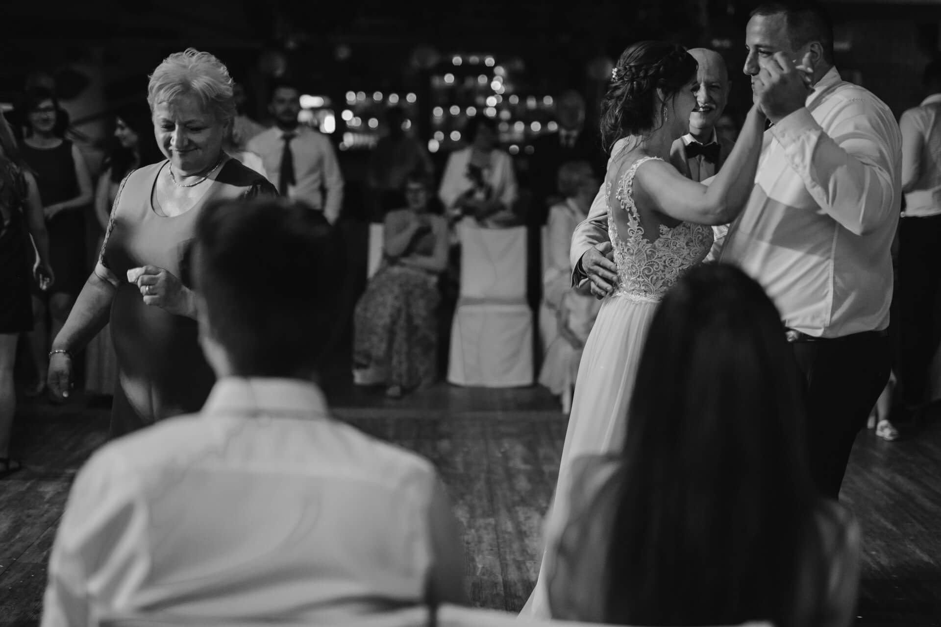 Sala weselna Stary Młyn ozdobiona w swojskim stylu wyglądała niesamowicie. Pięknie ozdobione stoły, stół wiejski, a raczej wóz wiejski robił mega wrażenia. Podwieszone do sufitu lampiony nadawały delikatnego oświetlenia sali, co bylo bardzo klimatyczne. W pewnym momencie wesela lamipony zostały zgaszony, na sali widać było tylko światło palących się świec. Efekt WOW! Wesele tradycyjnie zaczęło się od pierwszego tańca Państwa Młodych i z biegiem czasu nabierało tempa. Gości bawili się wyśmienicie, na parkiecie pojawił się Elvis Presley, który zrobił fantastyczne show. Apogeum zabawy nastąpiło, gdy zespół zszedł ze sceny i „poszedł w stoły”. Cała sala śpiewała razem z zespołem, goście na stojąco śpiewali piosenki razem z zespołem. Istnym szaleństwem było to, że goście zaczęli zsuwać wszystkie okrągłe stoły w jeden duży, machali serwetkami i tańczyli w objęciu osób stojących obok. Bomba enrgii na sali! Po tak aktywnej zabawie nadszedł czas na oczepiny po których udaliśmy się wykonać zdjęcia Pary Młodej w otoczeniu zimnych ognii. Ślub w plenerze, szalone wesele – to był cudowny dzień dla Kasi i Piotrka.