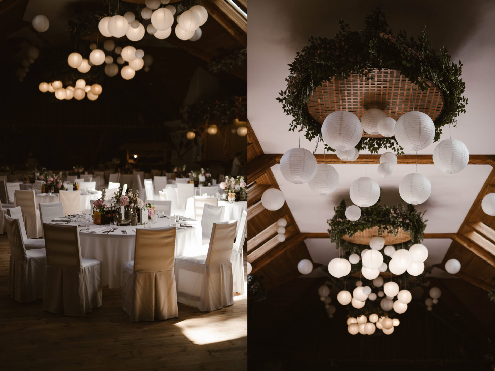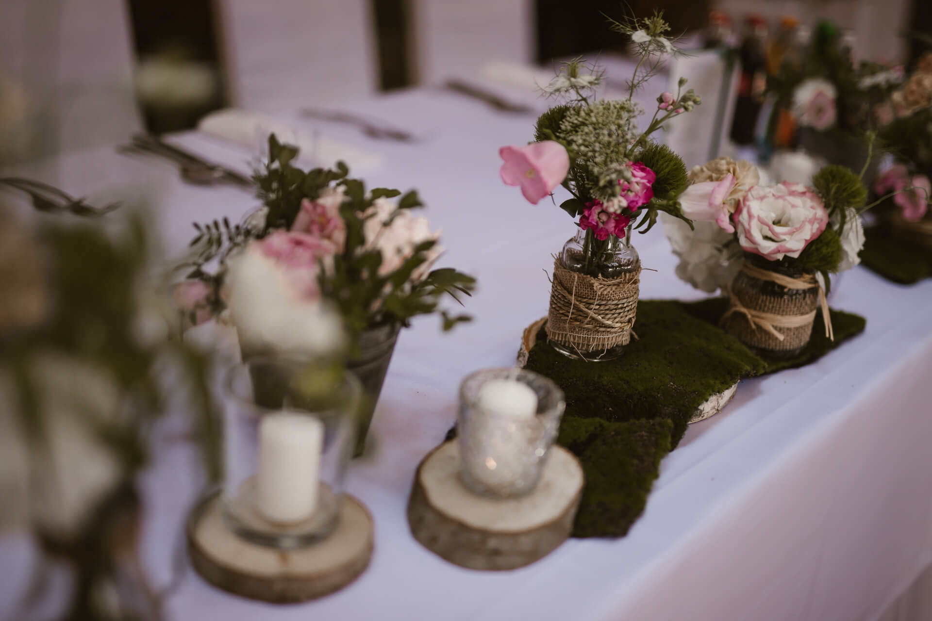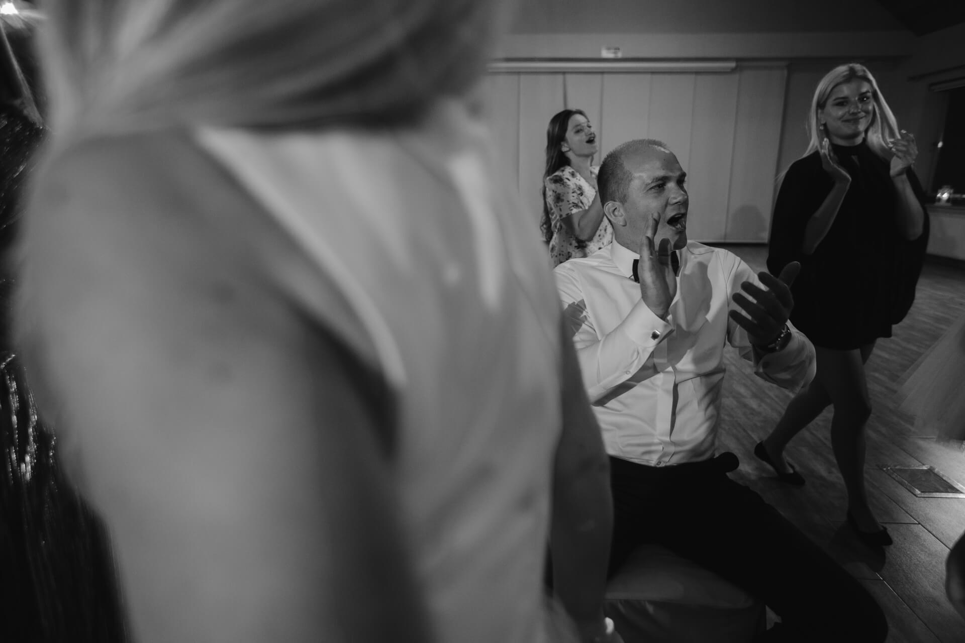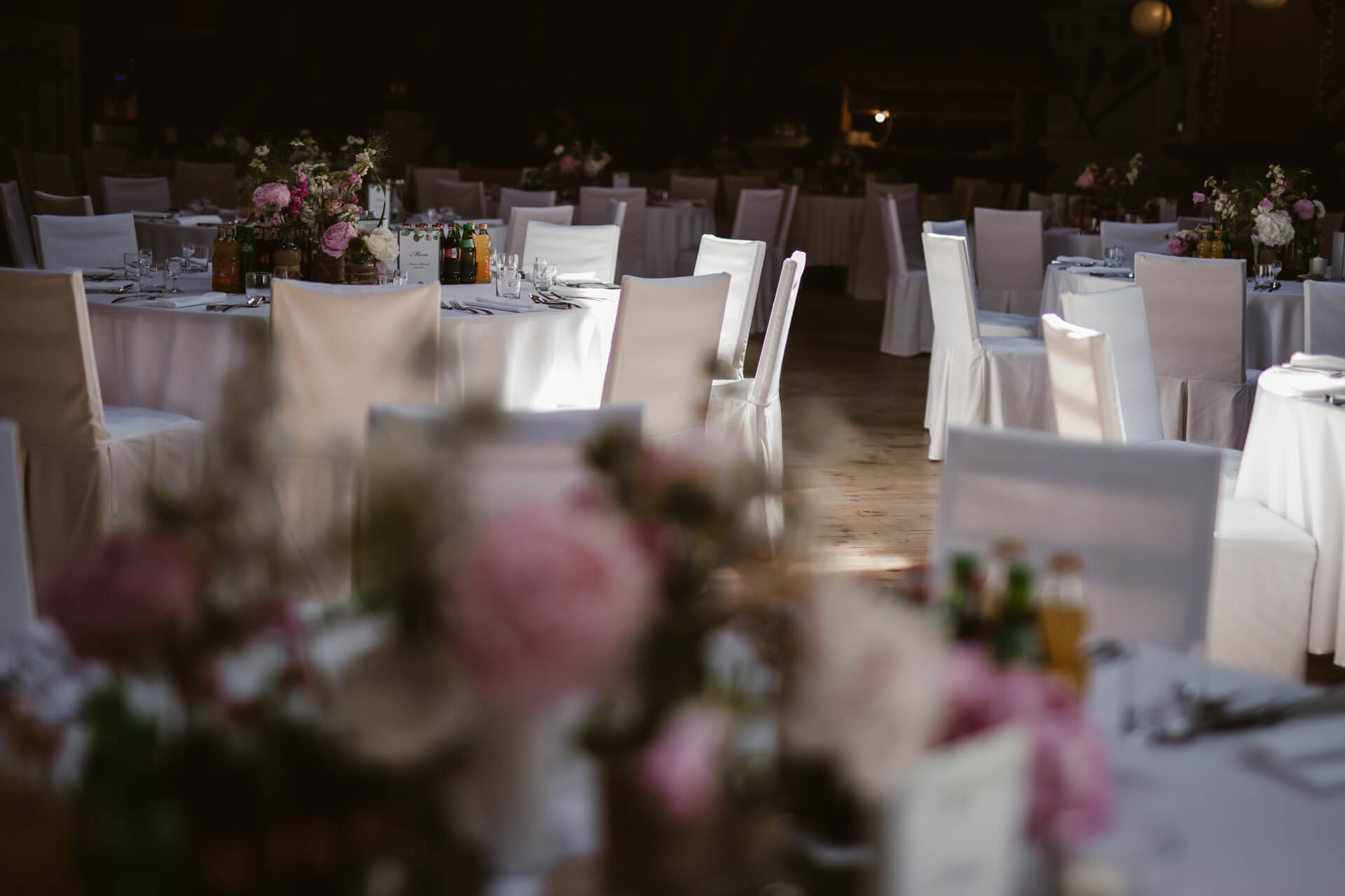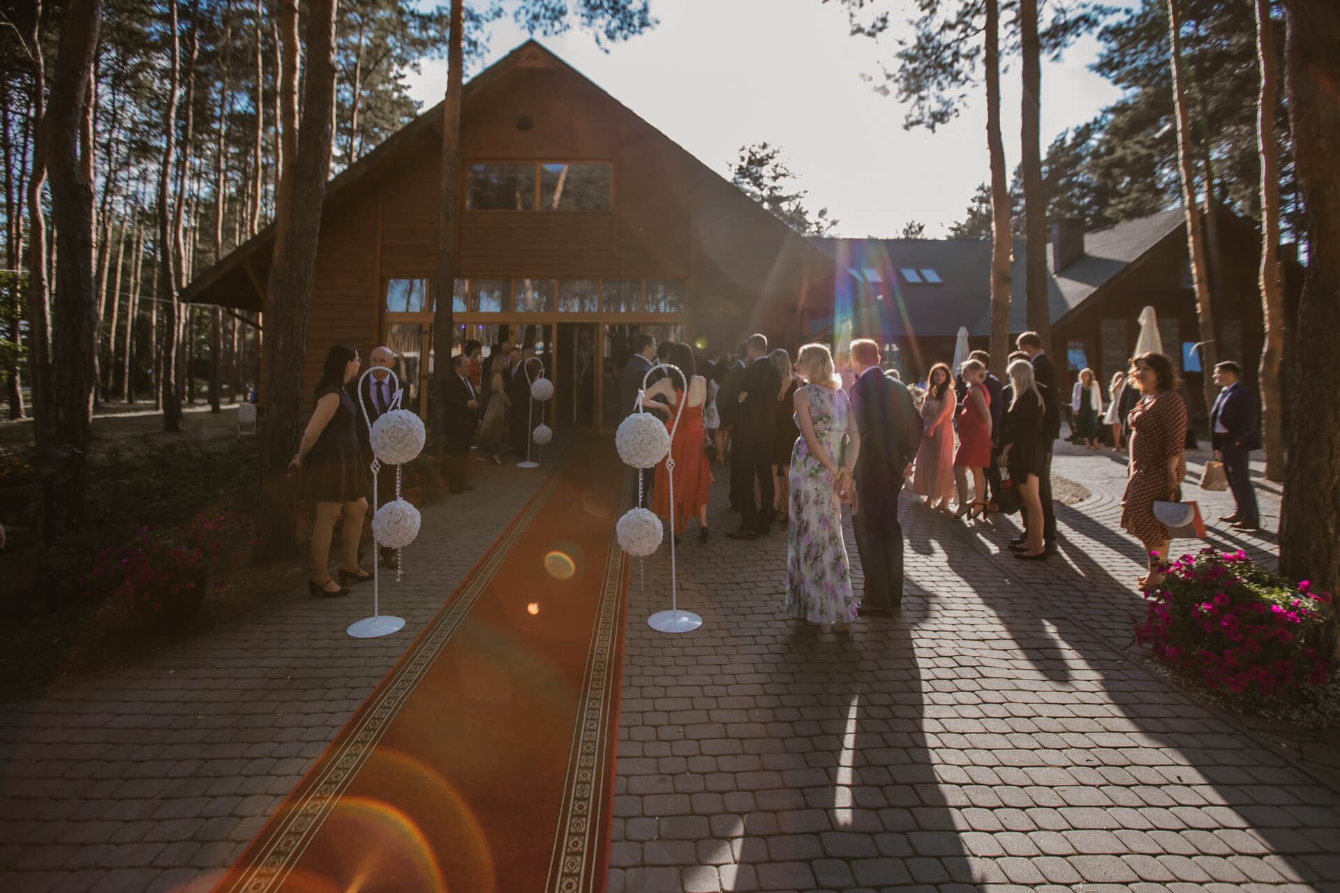 Sala weselna Stary Młyn ozdobiona w swojskim stylu wyglądała niesamowicie. Pięknie ozdobione stoły, stół wiejski, a raczej wóz wiejski robił mega wrażenia. Podwieszone do sufitu lampiony nadawały delikatnego oświetlenia sali, co bylo bardzo klimatyczne. W pewnym momencie wesela lamipony zostały zgaszony, na sali widać było tylko światło palących się świec. Efekt WOW! Wesele tradycyjnie zaczęło się od pierwszego tańca Państwa Młodych i z biegiem czasu nabierało tempa. Gości bawili się wyśmienicie, na parkiecie pojawił się Elvis Presley, który zrobił fantastyczne show. Apogeum zabawy nastąpiło, gdy zespół zszedł ze sceny i „poszedł w stoły”. Cała sala śpiewała razem z zespołem, goście na stojąco śpiewali piosenki razem z zespołem. Istnym szaleństwem było to, że goście zaczęli zsuwać wszystkie okrągłe stoły w jeden duży, machali serwetkami i tańczyli w objęciu osób stojących obok. Bomba enrgii na sali! Po tak aktywnej zabawie nadszedł czas na oczepiny po których udaliśmy się wykonać zdjęcia Pary Młodej w otoczeniu zimnych ognii. Ślub w plenerze, szalone wesele – to był cudowny dzień dla Kasi i Piotrka.