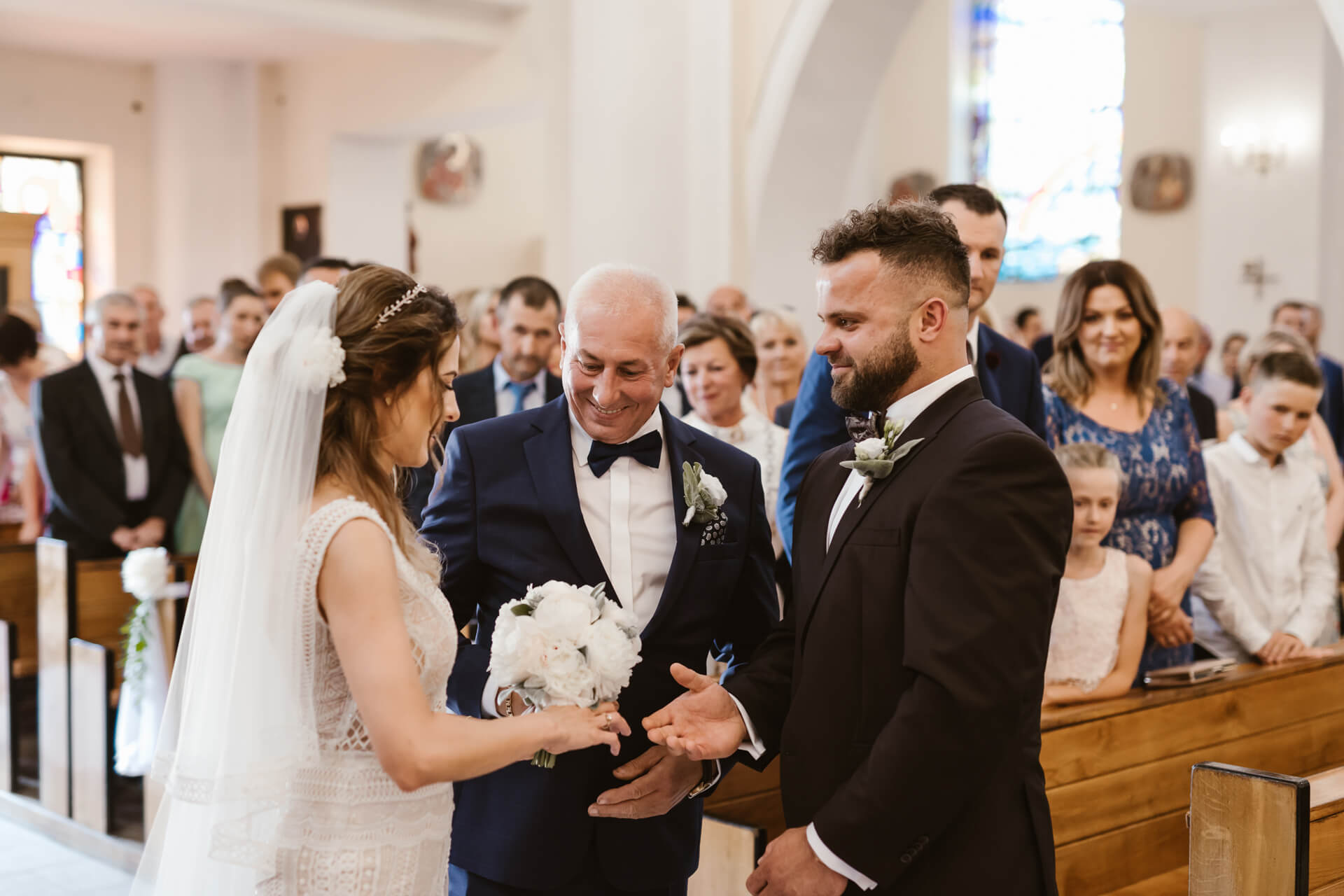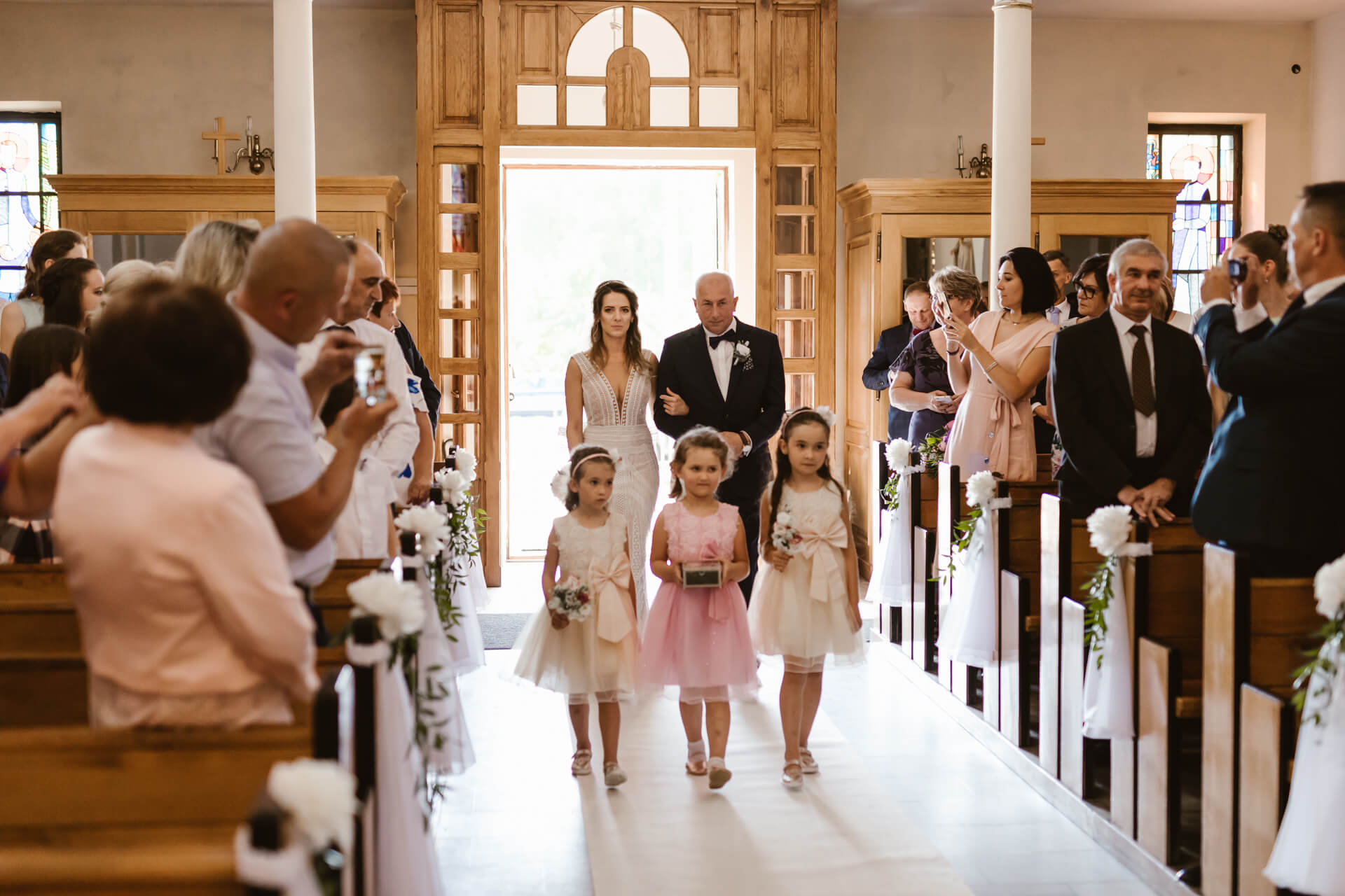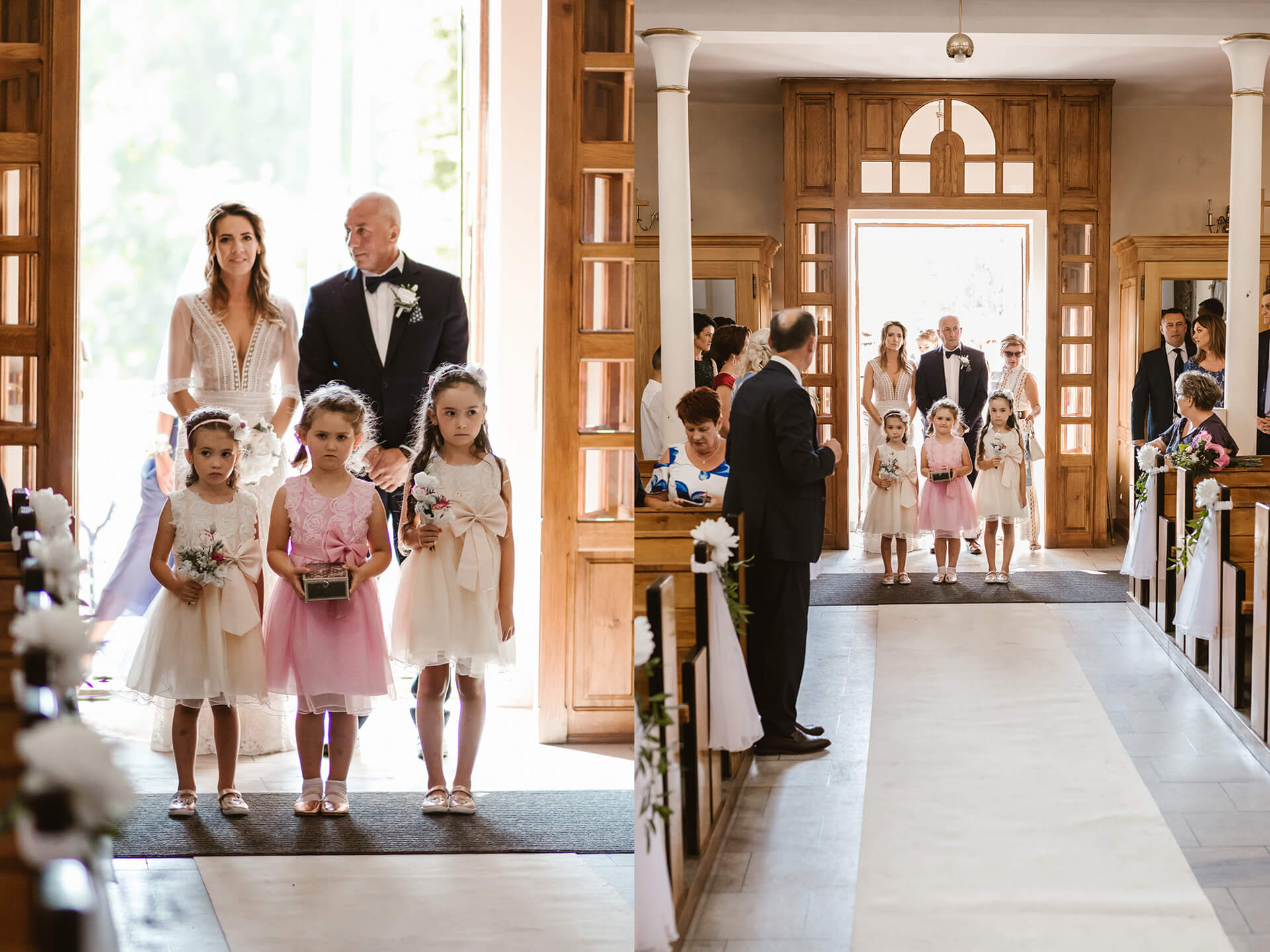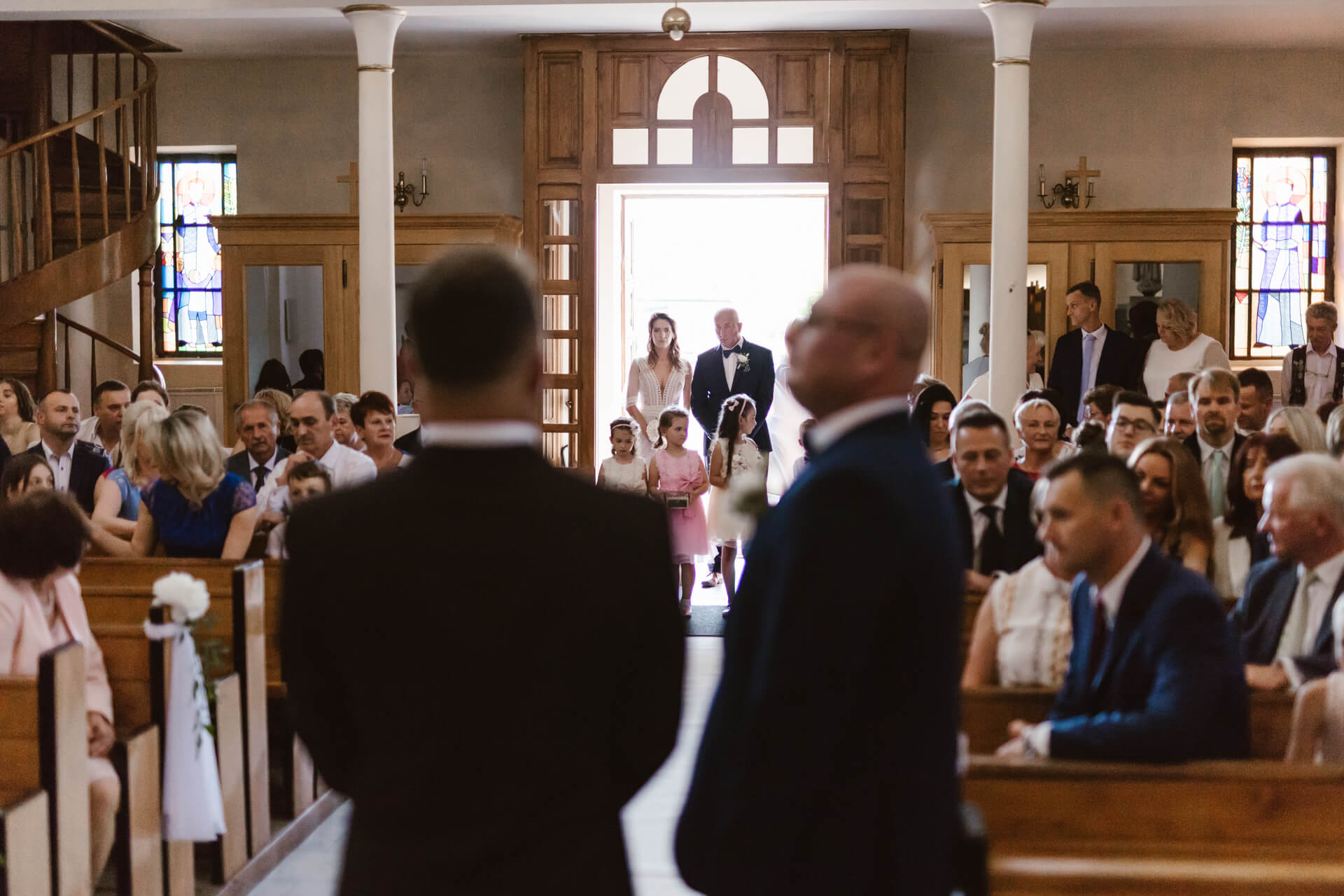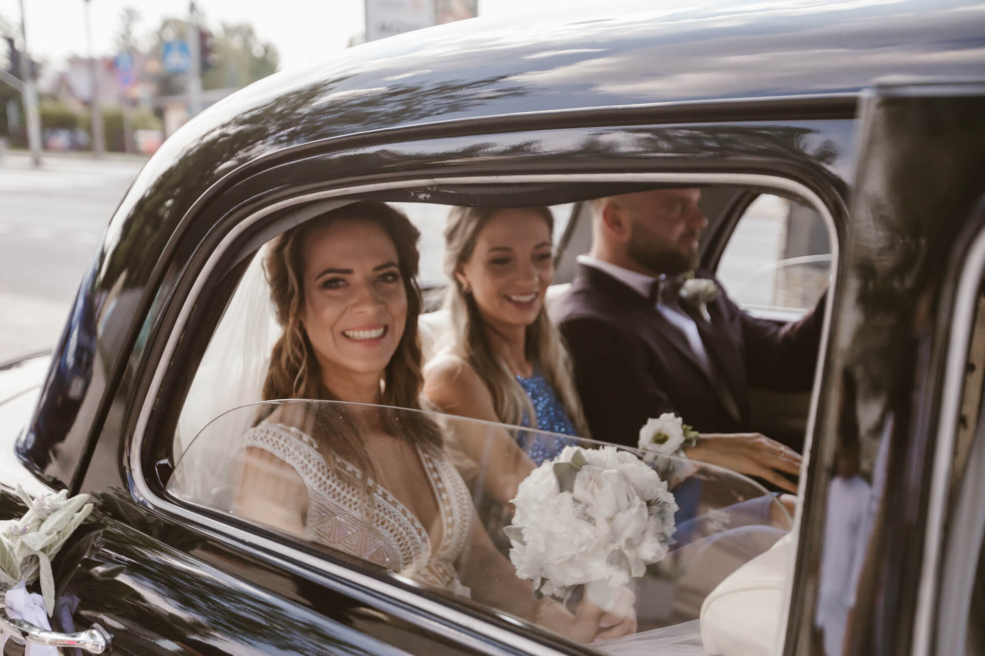 Reportaż rozpocząłem u przyszłego Pana Młodego – Damiana. Z nieba lał się żar, także zdjęcia z przygotowań staraliśmy się wykonać dość sprawnie. Następnie udałem się do Martyny, gdzie przed domem stał pięknie ozdobiony, klasyczny Mercedes którym Para Młoda miała jechać na swój ślub. Uwielbiam klasyczne auta z duszą, a ten egzemplarz zrobił na mnie duże wrażenie. Panna Młoda wyglądała oszałamiająco, a suknia ślubna robiła wrażenie na gościach weselnych. Po zakończeniu przygotowań nadszedł czas na first look oraz błogosławieństwo. Moment w którym przyszli Nowożeńcy zobaczyli się tego dnia po raz pierwszy obfitował w dużo radości i uśmiechów. I tak było w dalszej części dnia, choć łez szczęścia również nie zabrakło. Po błogosławieństwie Młodzi ruszyli na ślub do kościoła w Parafii św. Andrzeja Boboli w Markach. Po drodze zatrzymała ich brama, inna niż większość spotykanych bram, ale to zobaczycie na zdjęciach 🙂
