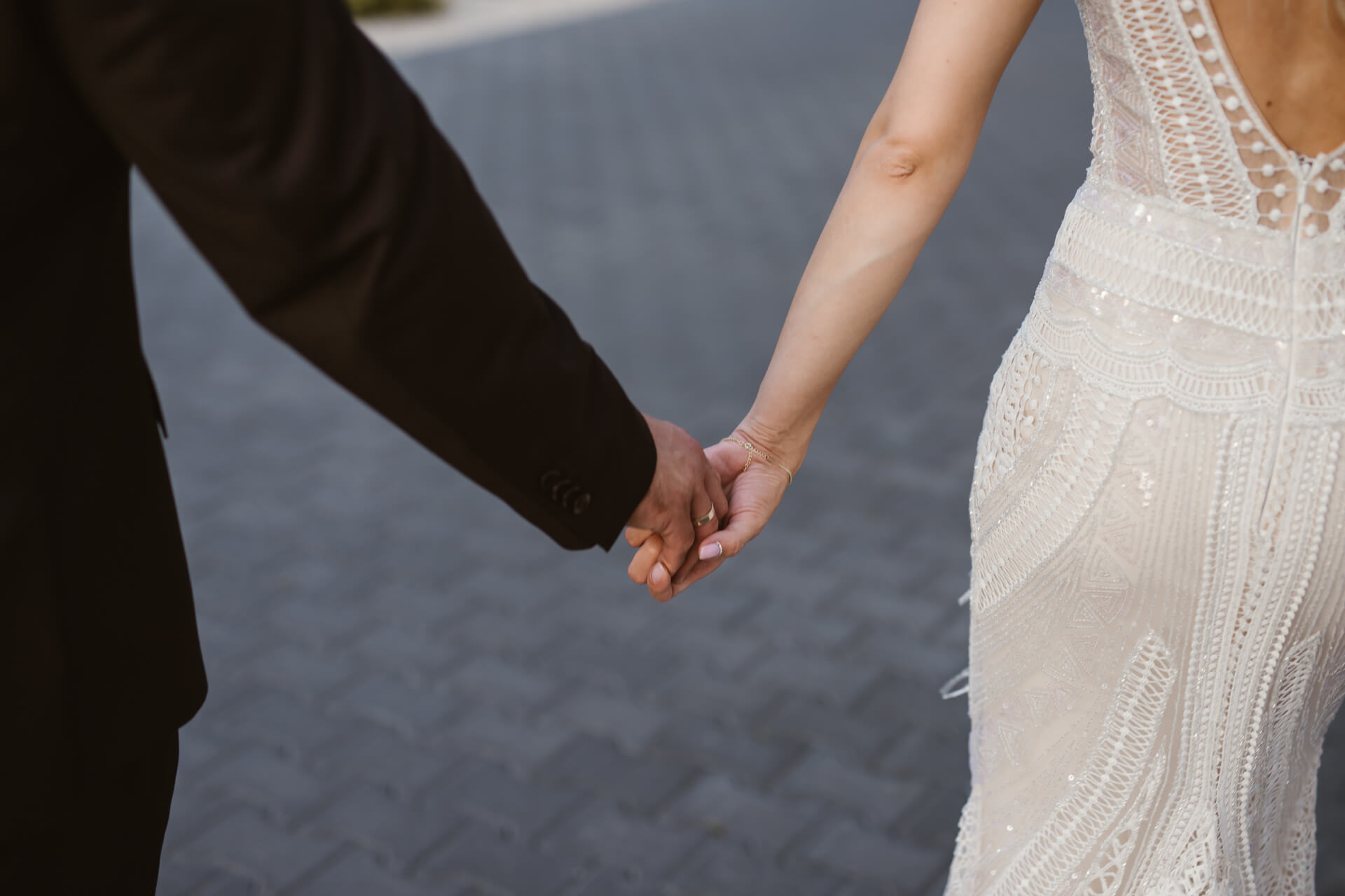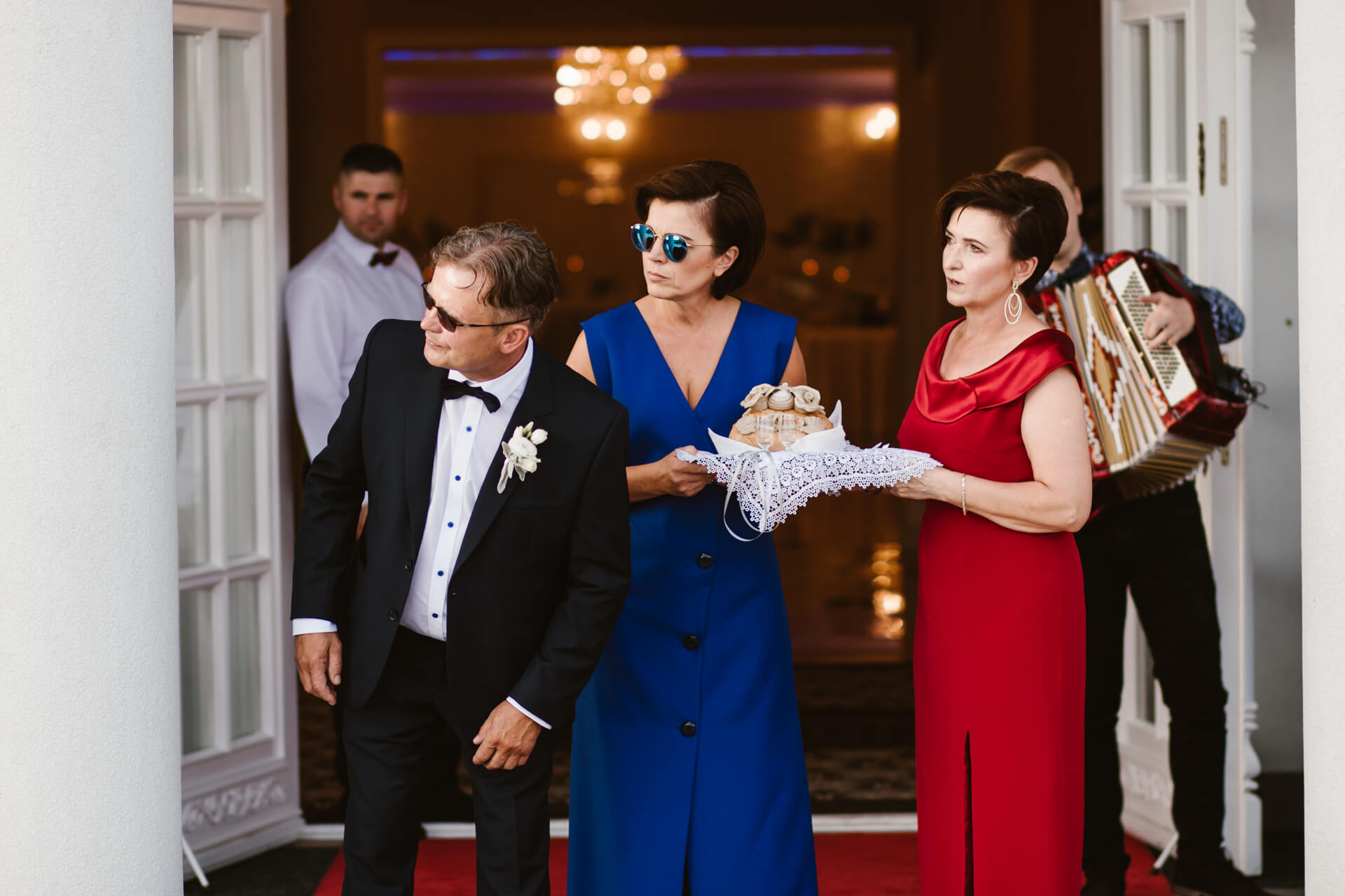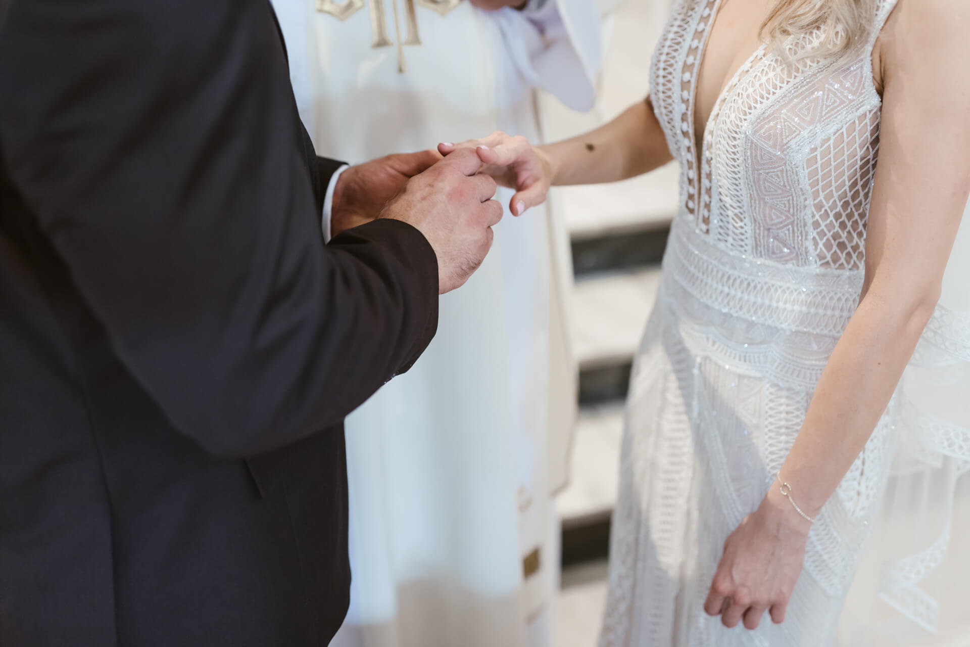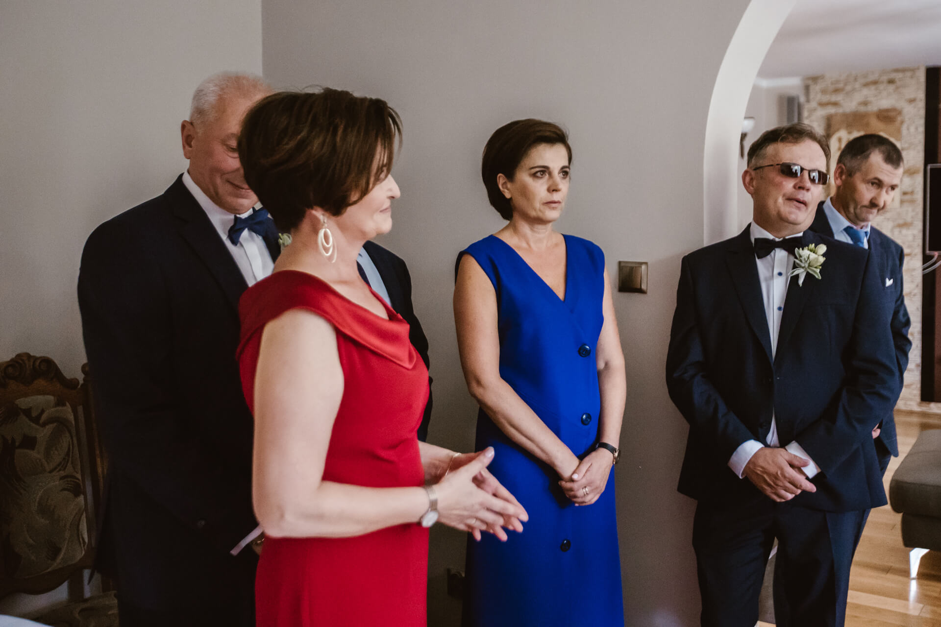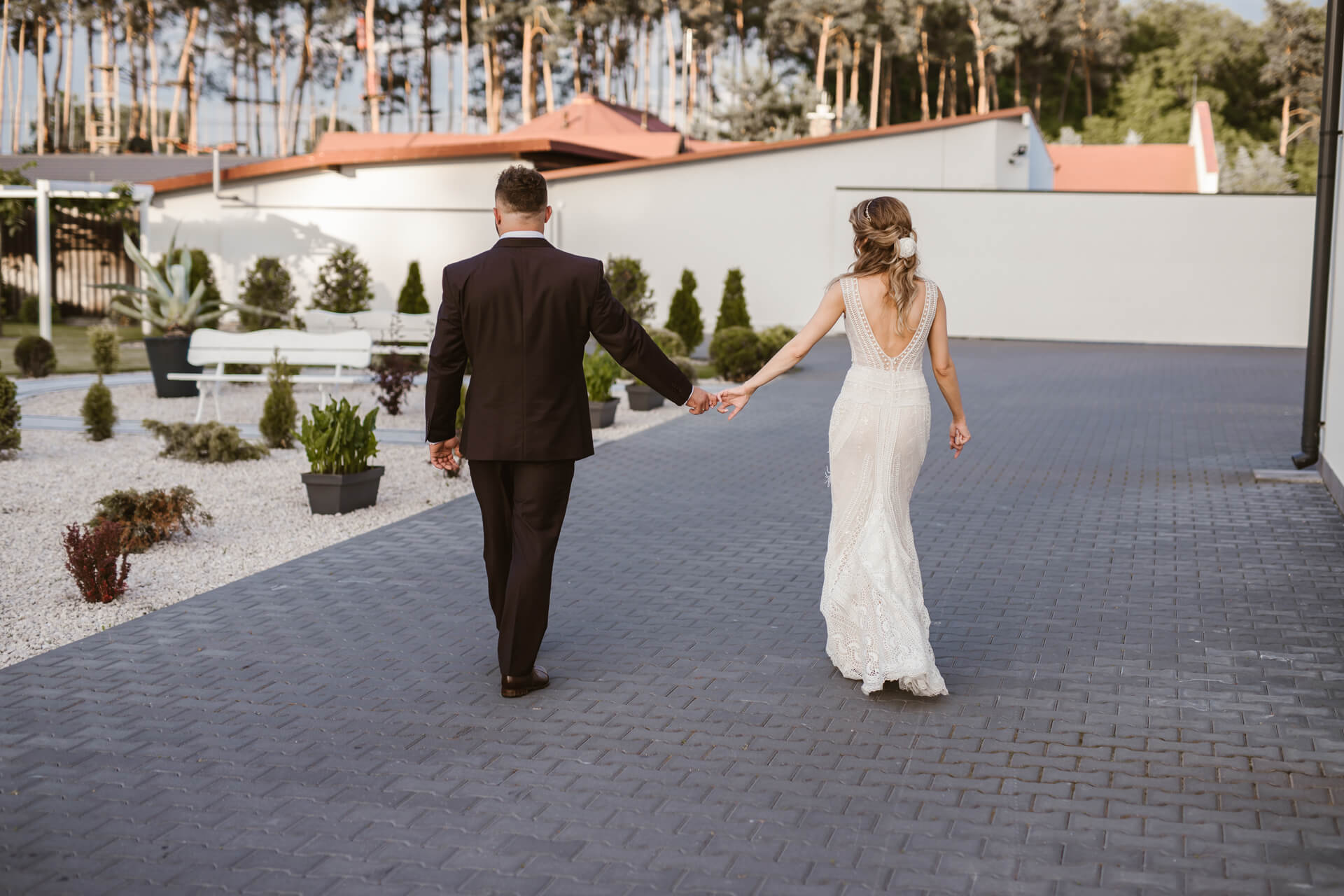 Reportaż rozpocząłem u przyszłego Pana Młodego – Damiana. Z nieba lał się żar, także zdjęcia z przygotowań staraliśmy się wykonać dość sprawnie. Następnie udałem się do Martyny, gdzie przed domem stał pięknie ozdobiony, klasyczny Mercedes którym Para Młoda miała jechać na swój ślub. Uwielbiam klasyczne auta z duszą, a ten egzemplarz zrobił na mnie duże wrażenie. Panna Młoda wyglądała oszałamiająco, a suknia ślubna robiła wrażenie na gościach weselnych. Po zakończeniu przygotowań nadszedł czas na first look oraz błogosławieństwo. Moment w którym przyszli Nowożeńcy zobaczyli się tego dnia po raz pierwszy obfitował w dużo radości i uśmiechów. I tak było w dalszej części dnia, choć łez szczęścia również nie zabrakło. Po błogosławieństwie Młodzi ruszyli na ślub do kościoła w Parafii św. Andrzeja Boboli w Markach. Po drodze zatrzymała ich brama, inna niż większość spotykanych bram, ale to zobaczycie na zdjęciach 🙂