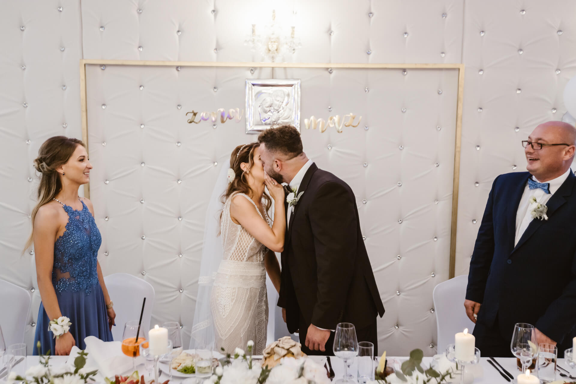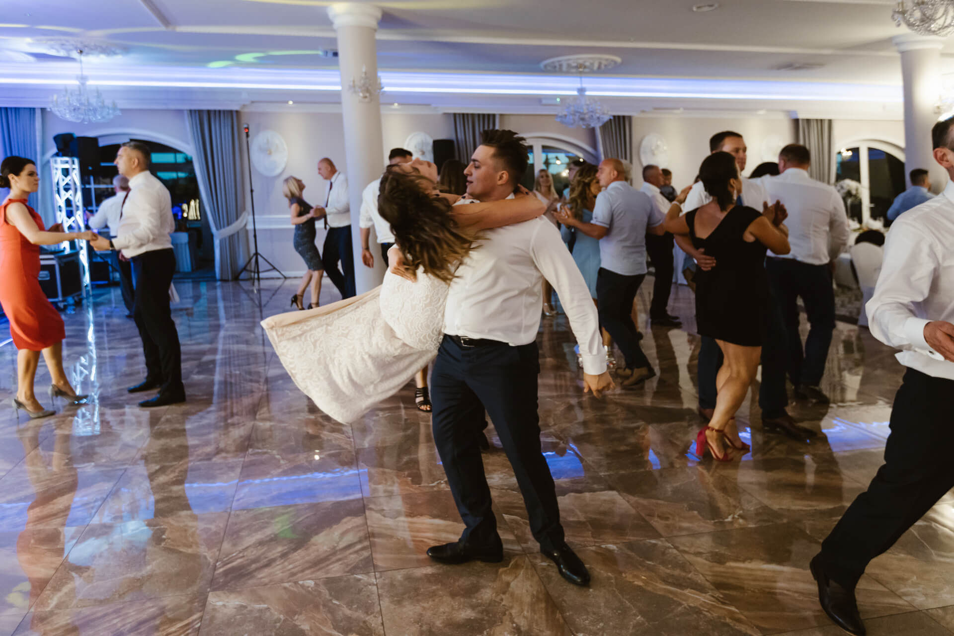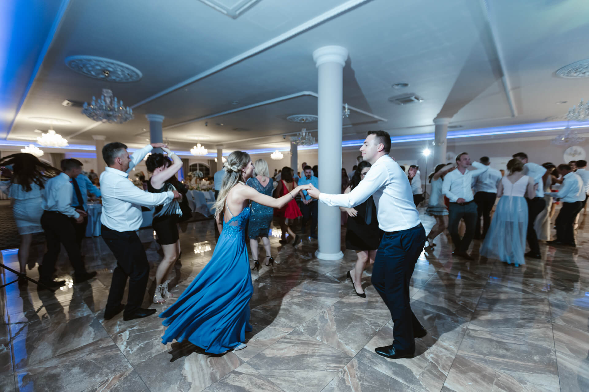 Po ceremonii zaślubin goście i Nowożeńcy udali na piękną salę weselną. Toasty, rozmowy pomiędzy gośćmi – i nadszedł czas na pierwszy taniec. Taniec w chmurach, ktróy okazał się petardą, za sprawą Pana Młodego, który w cudowny sposób podniósł swoją małżonkę. Goście zareagowali bardzo żywiołowo – i nie ma co się dziwić, to było przysłowiowe „coś” 🙂 W czasie wesela parkiet pękał w szwach, goście świetnie bawili się przy muzyce granej przez zespół. Udało nam się wygospodarować dosłownie kilkanaście minut na mini sesję plenerową w ogrodzie przylegającym do sali Venus Blue w Józefowie. Piękny zielony teren z altanką – warto wykorzystywać potencjał miejsca i dlatego często polecam moim parom sesję w dniu ślubu. Po tradycyjnych oczepinach ponownie udaliśmy się do ogrodu by zrobić zdjęcie grupowe z zimnymi ogniami. Tego dnia ilość emocji utwierdziła mnie w przeświadczeniu, że fotografia ślubna to cudna dziedzina.