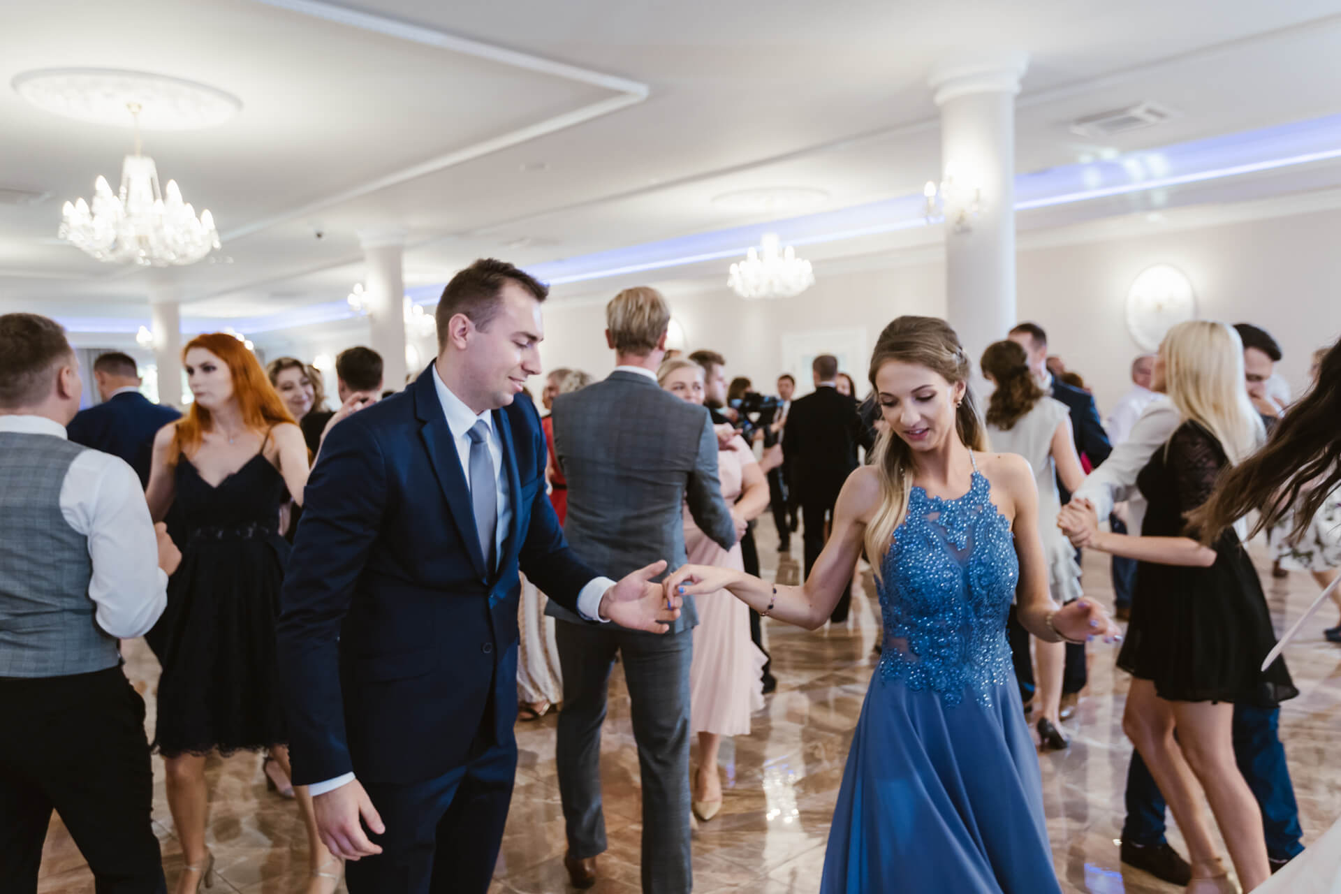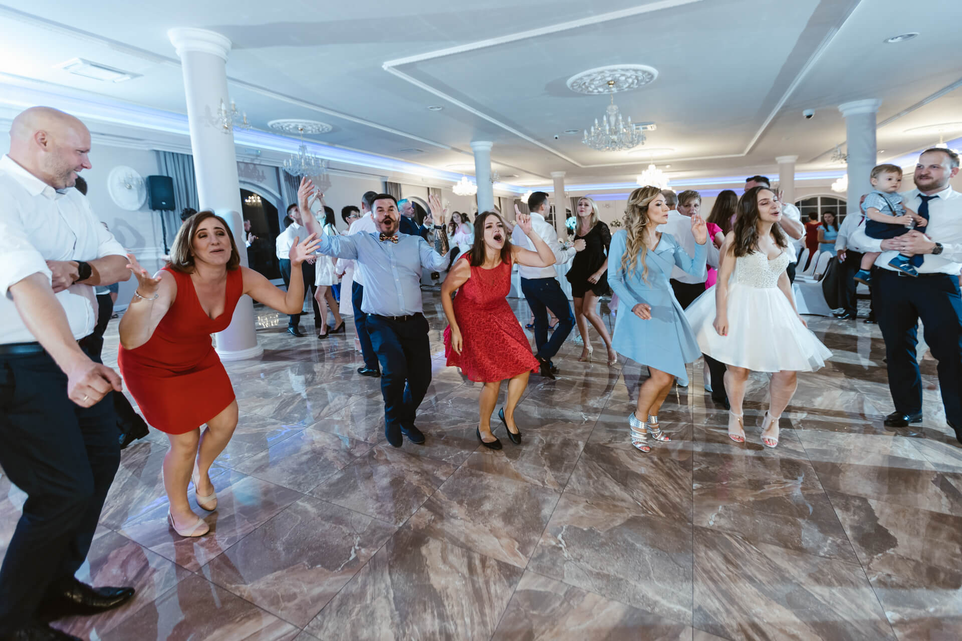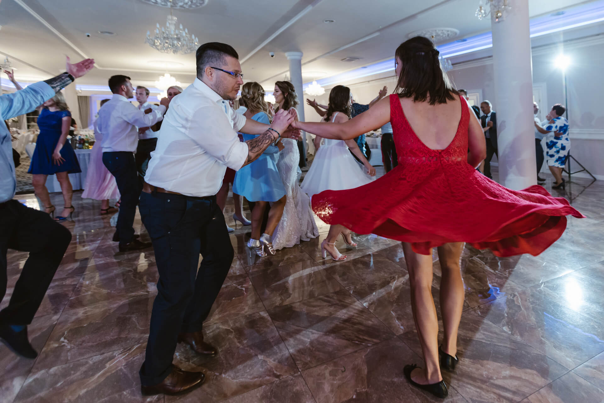 Po ceremonii zaślubin goście i Nowożeńcy udali na piękną salę weselną. Toasty, rozmowy pomiędzy gośćmi – i nadszedł czas na pierwszy taniec. Taniec w chmurach, ktróy okazał się petardą, za sprawą Pana Młodego, który w cudowny sposób podniósł swoją małżonkę. Goście zareagowali bardzo żywiołowo – i nie ma co się dziwić, to było przysłowiowe „coś” 🙂 W czasie wesela parkiet pękał w szwach, goście świetnie bawili się przy muzyce granej przez zespół. Udało nam się wygospodarować dosłownie kilkanaście minut na mini sesję plenerową w ogrodzie przylegającym do sali Venus Blue w Józefowie. Piękny zielony teren z altanką – warto wykorzystywać potencjał miejsca i dlatego często polecam moim parom sesję w dniu ślubu. Po tradycyjnych oczepinach ponownie udaliśmy się do ogrodu by zrobić zdjęcie grupowe z zimnymi ogniami. Tego dnia ilość emocji utwierdziła mnie w przeświadczeniu, że fotografia ślubna to cudna dziedzina.